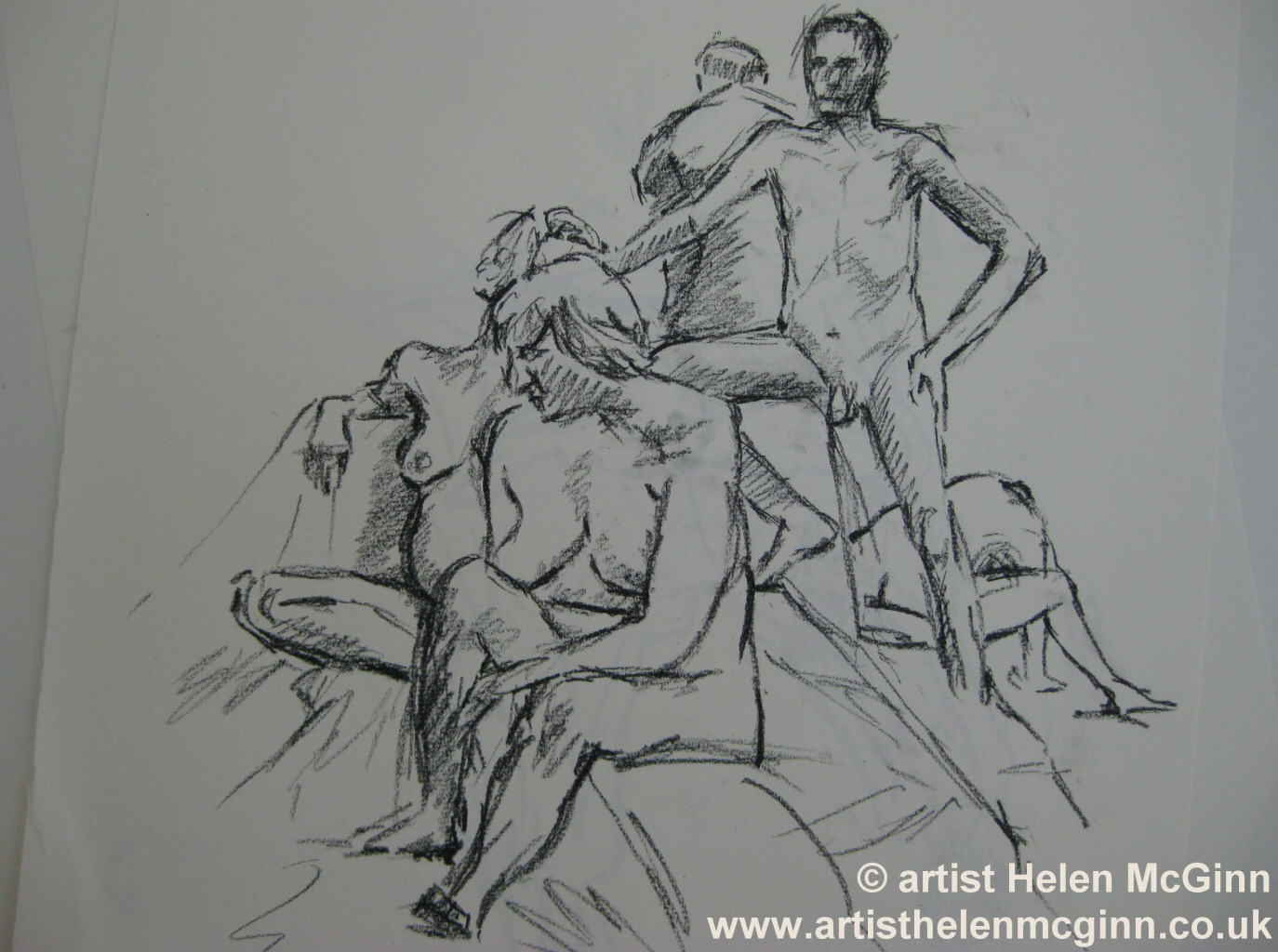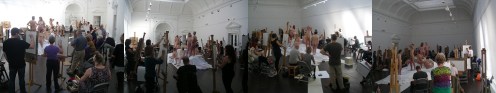 The aim was to assemble ten life models, with a fifty-fifty gender split. In the weeks before there was some doubt as to whether enough female models would come forward. Cometh the day, however, the split went the other way: we were four men and six women, with a seventh in the very late stages of pregnancy joining us for the morning.