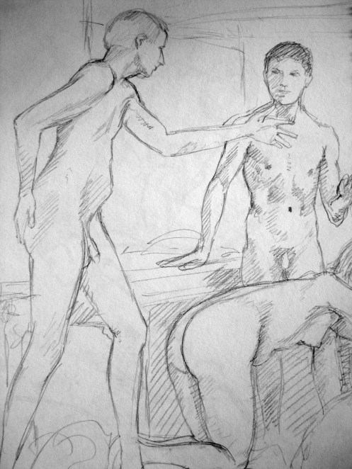 The dozen-or-so models were split into two groups: one in the centre of the room; the other on a stage at the far end. It would be a three-hour session with a break in the middle. Short poses to begin with, followed by two loosely organised half-hour tableaux. What makes this more interesting than solo modelling is that there’s no benefit in sticking to tried and tested poses; it’s of greater importance to find a pose that creates a dynamic with those adjacent.