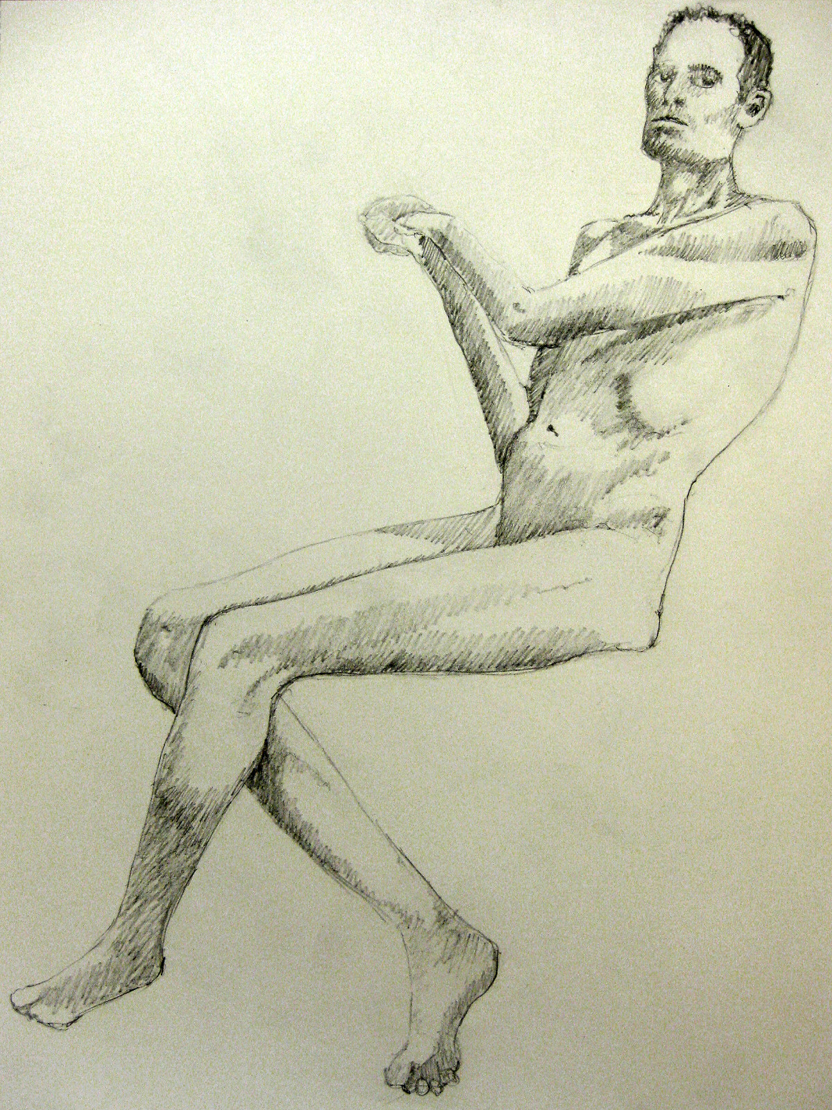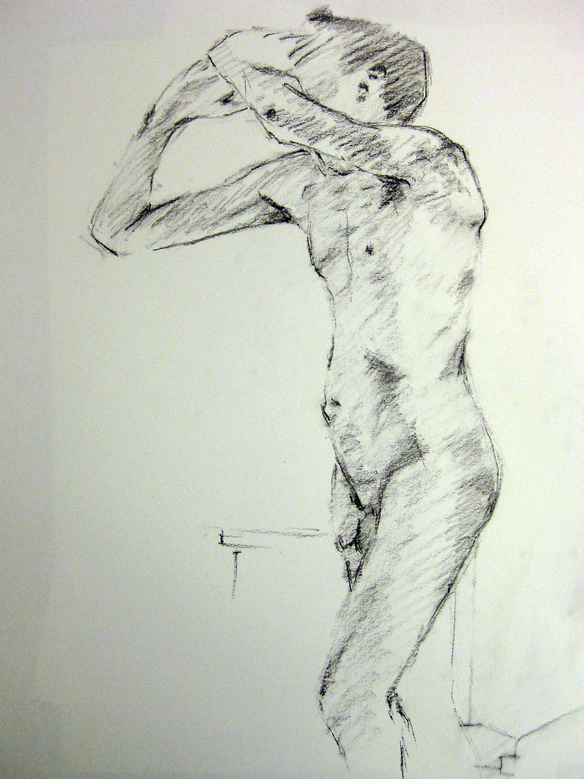 Five minutes into each pose Patrick walked softly around the artists, offering a few words of advice on lines, spaces, foreshortening, etc. One or two artists felt they were not ‘in the zone’. As a model it’s difficult to know how best to respond, if at all. My poses tend to emphasise my longer-than-average limbs and fingers, which I’m conscious may present unfamiliar challenges to artists. Should I tuck them away and close up in subsequent poses if I hear this feedback, or would it be presumptuous to change my approach? It’s an interesting dilemma.
