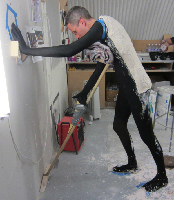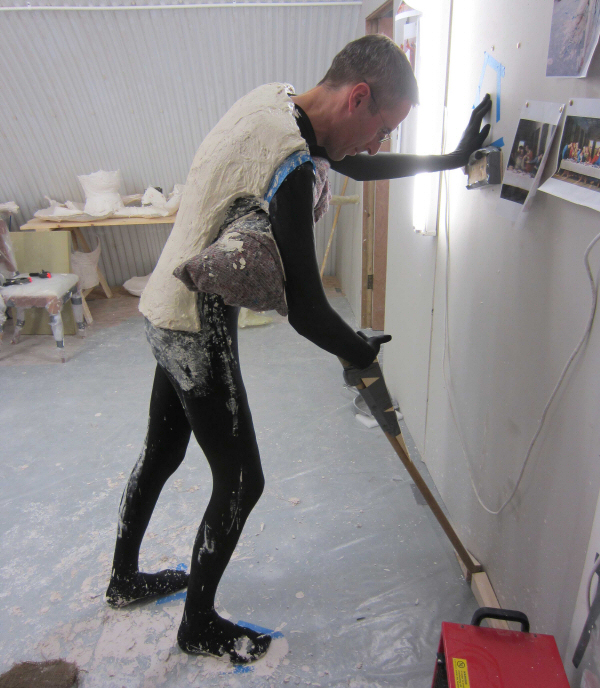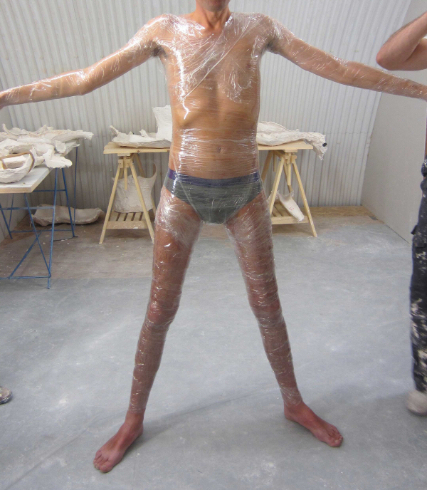 To recap: the process required me to be tightly wrapped in cling film, then zipped into a one-piece body sock, smeared all over with Vaseline and conditioner, and finally to have plaster applied to my body in four phases: back torso; arms; front torso; legs. Here are a few pictures: