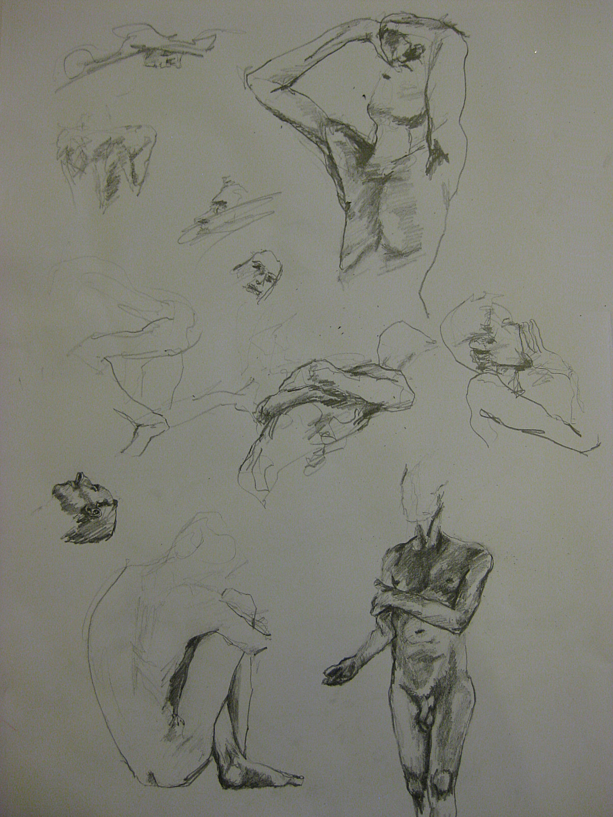 A 40-minute standing pose occupied the whole of the second session, leaning across the frame of the stepladder with my arms folded over the top. I thought I had found a reasonably comfortable balance but misjudged how the clammy night would steadily bring out a mist of sweat. For the last 20 minutes it was a constant strain to prevent my arms sliding across each other and out of position.