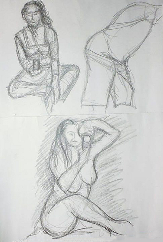 Here was an unexpected novelty. In addition to the unusual nature of the whole piece, I would now be modelling for artists who themselves were all experienced life models. No pressure there, then! But such was the wonderful easy-going feeling among the group – an immediate bond, I think – that the work was effortless fun throughout.