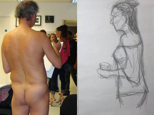 At the next double-clap it was time for Alessandra and me to remove our clothes. Our company of nine naked artists was now life drawing two nude models. Some visitors lingered while others came and went; in addition to the many excellent artworks on display, we were in competition with a finite supply of complimentary wine upstairs.