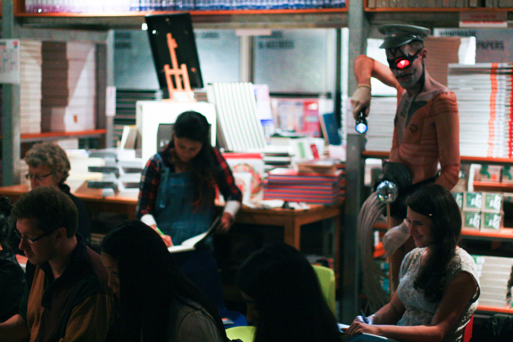 I first set about menacing the artists with my flashlight beam, or simply by looming over them while they drew. Next I approached Nikki and chalked enigmatic symbols on a board to indicate my instructions: Ava Iscariot was to be taken for ‘upgrading’ to cyborg. I stood sentinel above the cowering Ava as we continued her final 10 minutes in a duo pose.