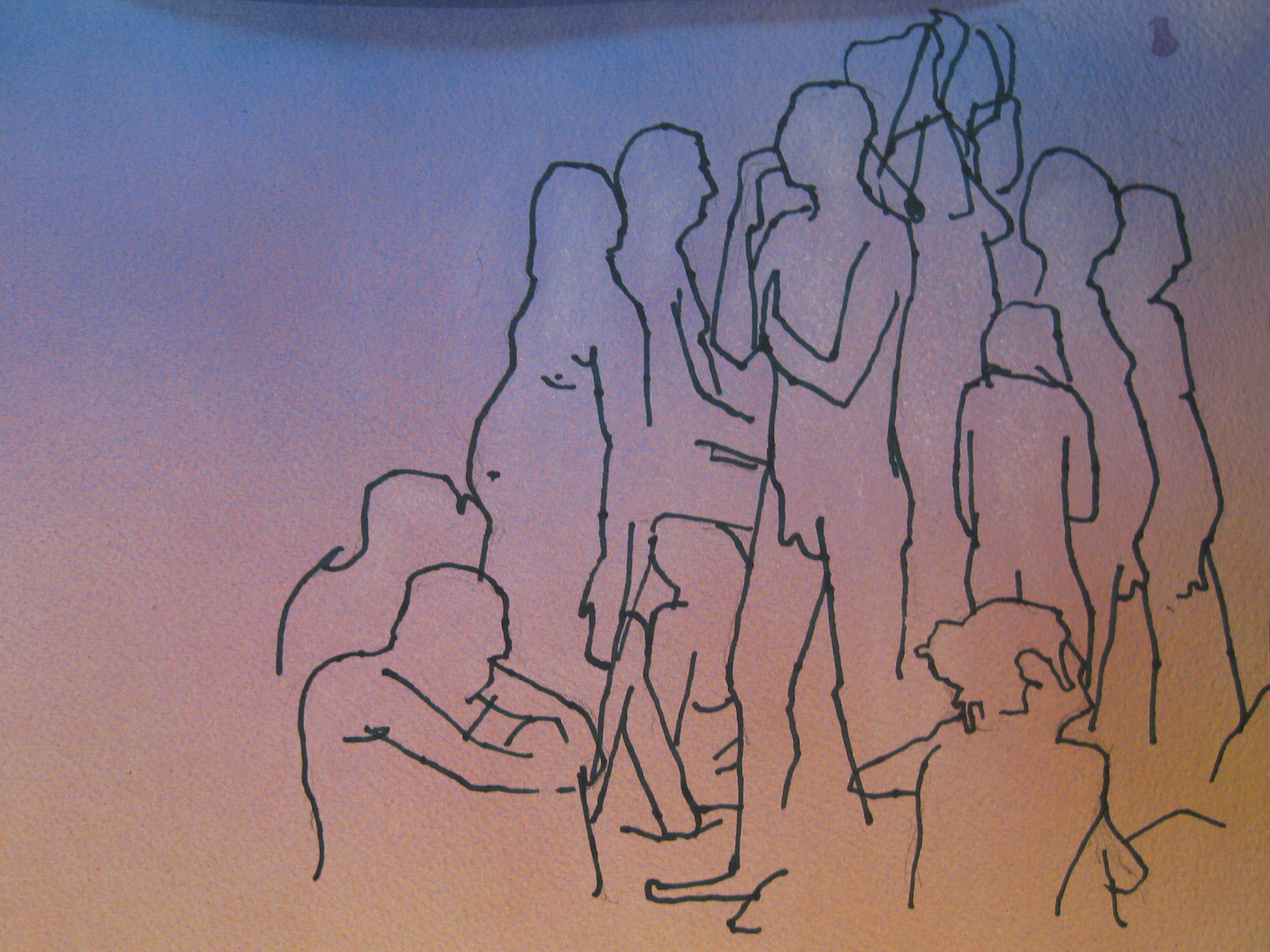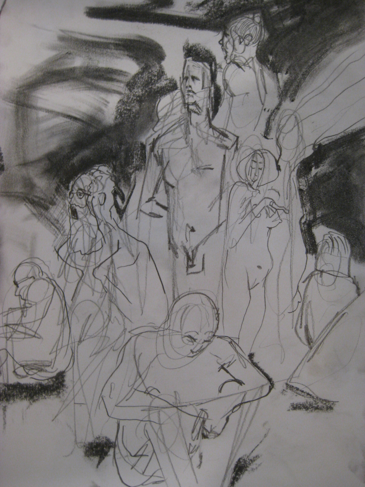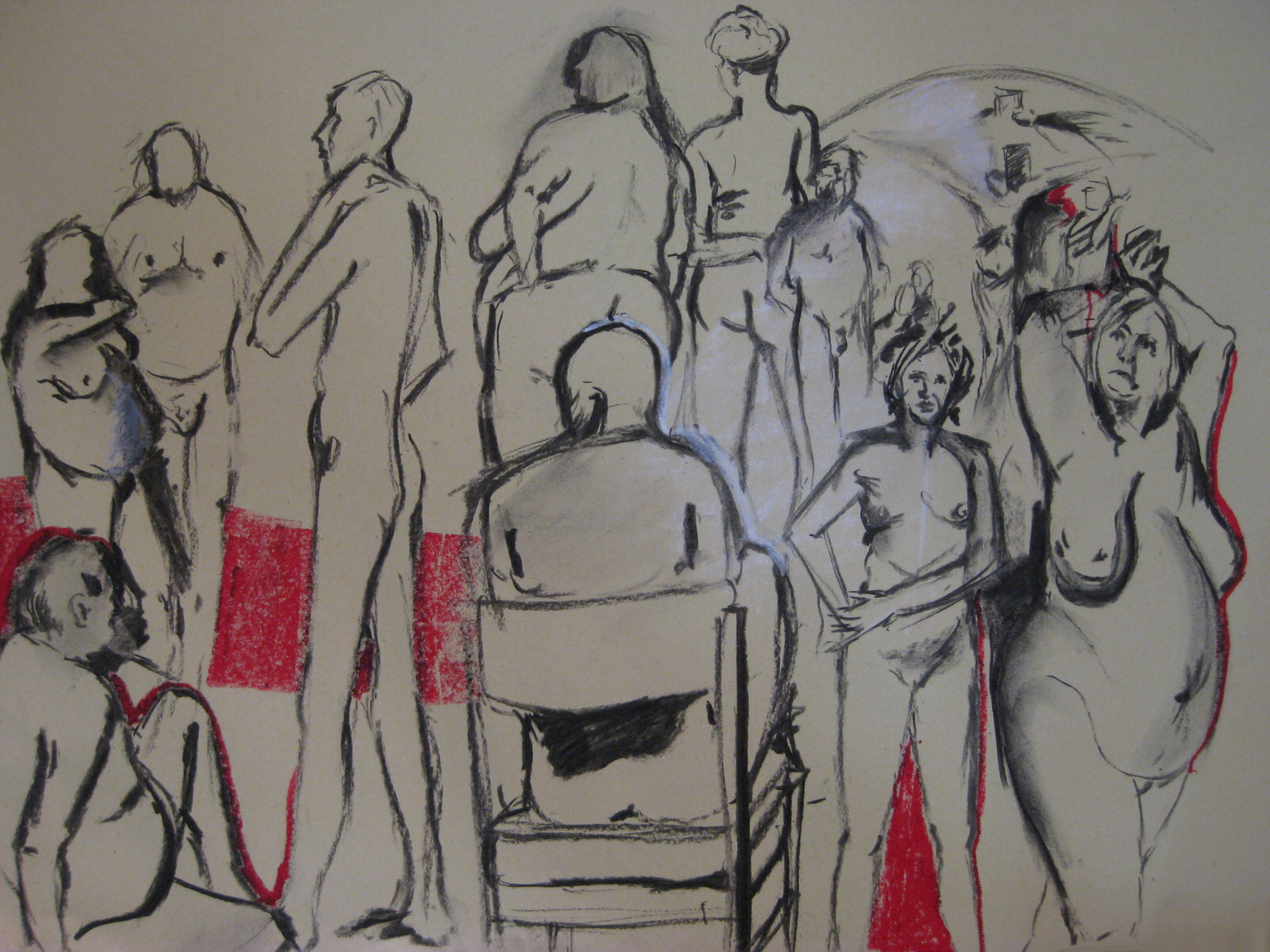 But no. Instead, after a couple of minutes Esther moved amongst us and made subtle signs to individual models. When we each received our signal, we quickly undressed and stood in pose. Nude bodies rose up across the congregation over a period of ten minutes. Artists were never sure who would be next. Afterwards at least one said she dreaded getting the sign in case it meant she had to stand naked too.
