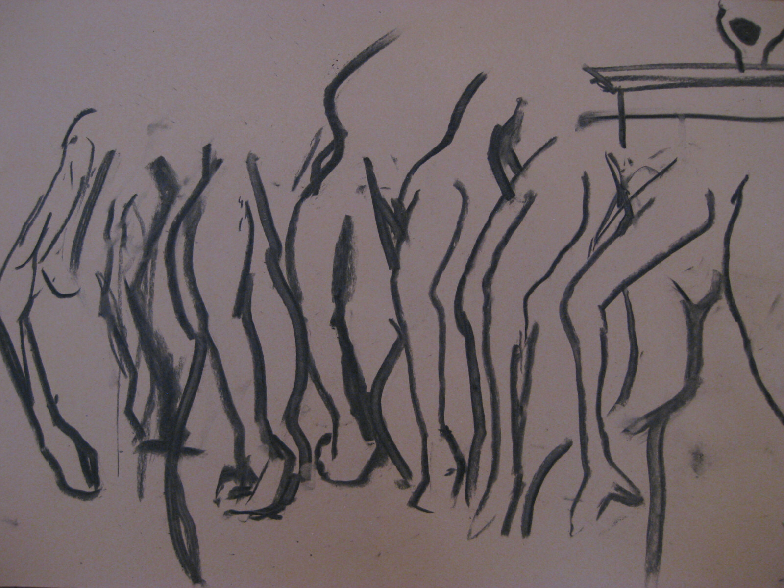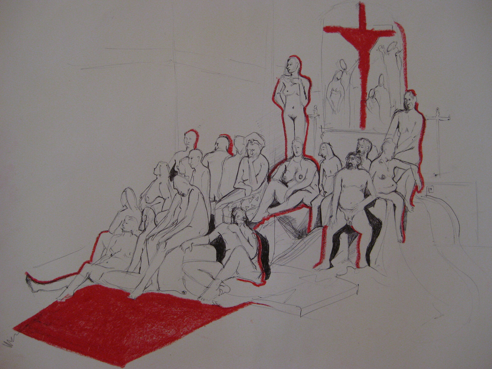 Rather than change into robes we simply set aside surplus layers of clothes, removed our underwear, and then dressed again. As artists began to fill the wide space of the church, collecting complimentary art materials before settling on chairs or the floor, so we did the same, discretely and anonymously scattering ourselves among them.