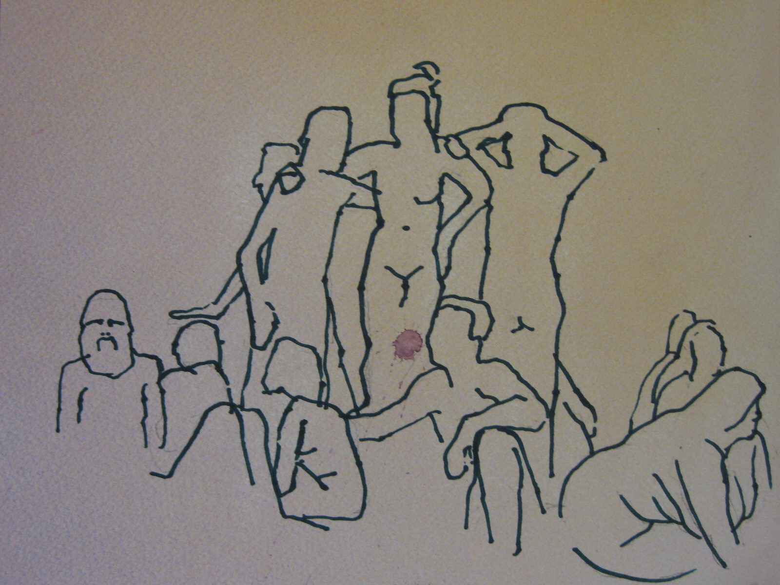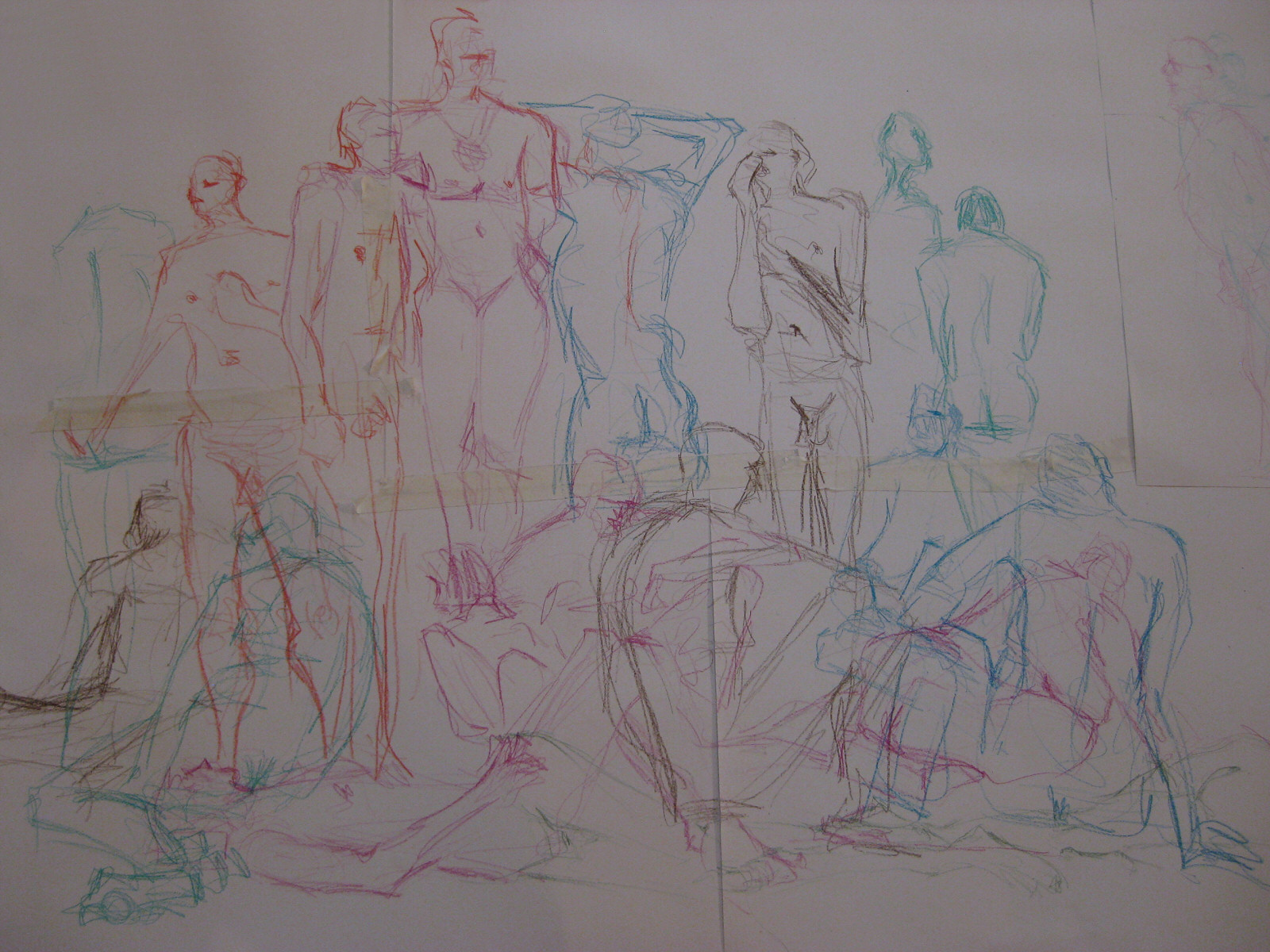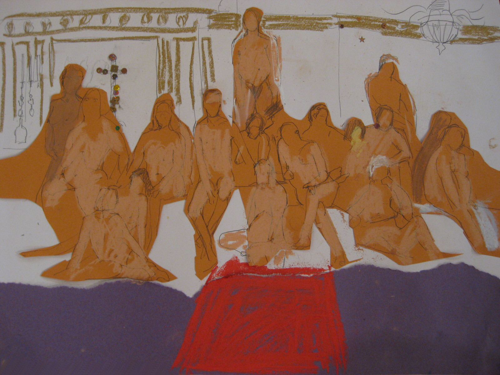 Our final performance was a more conventional group tableau. Once more we disrobed out of sight and then filed out to our cushioned tables and stools. I sat slightly to the left of centre, as seen from the floor, and again went for a single long pose – right arm resting on right thigh, left arm extended to the table, left leg hooked behind right.