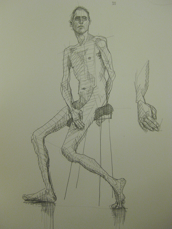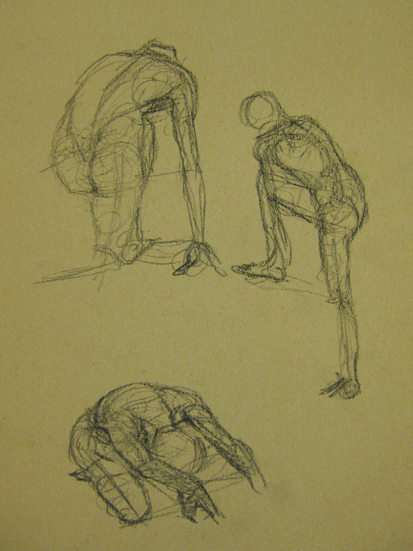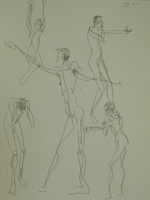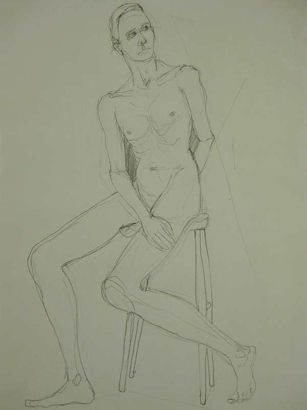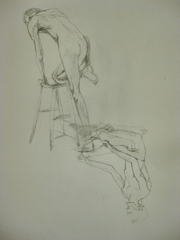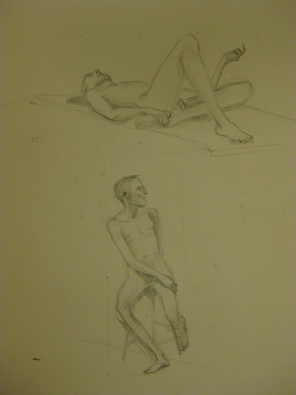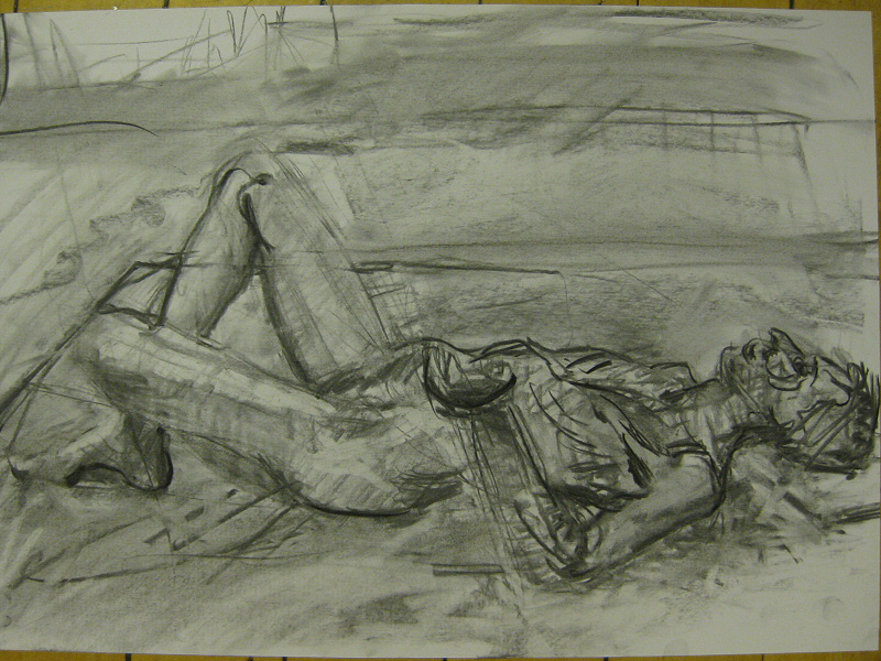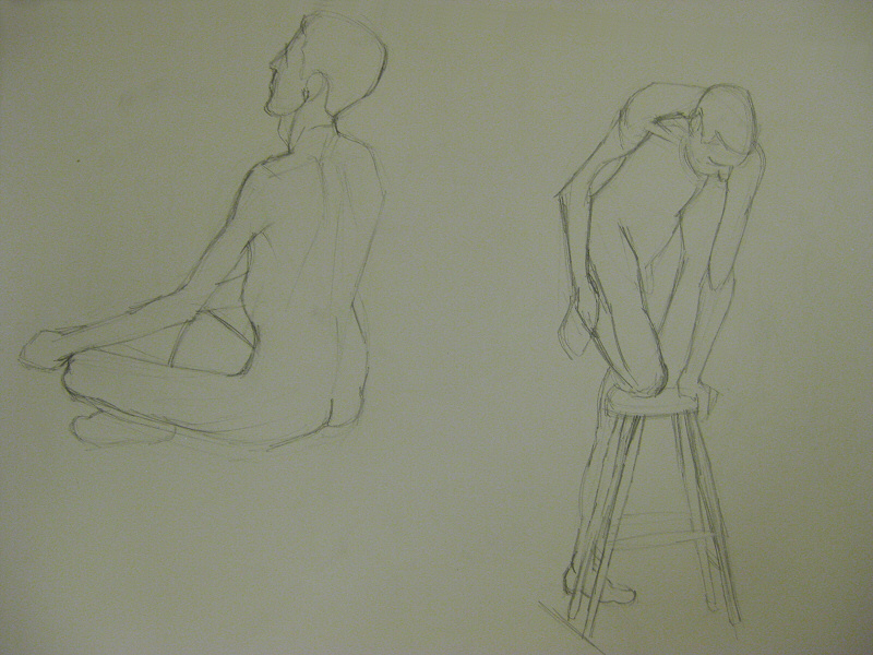 I open the session with a 10-minute seated pose then work through five one-minute poses. The sequence continues: 3, 3, 5, 10, 15. We then break for piping hot lentil stew, rice, garlic bread, tea, marshmallows and a jaffa cake: a nice balanced diet to savour whilst chatting and browsing some quite excellent work: