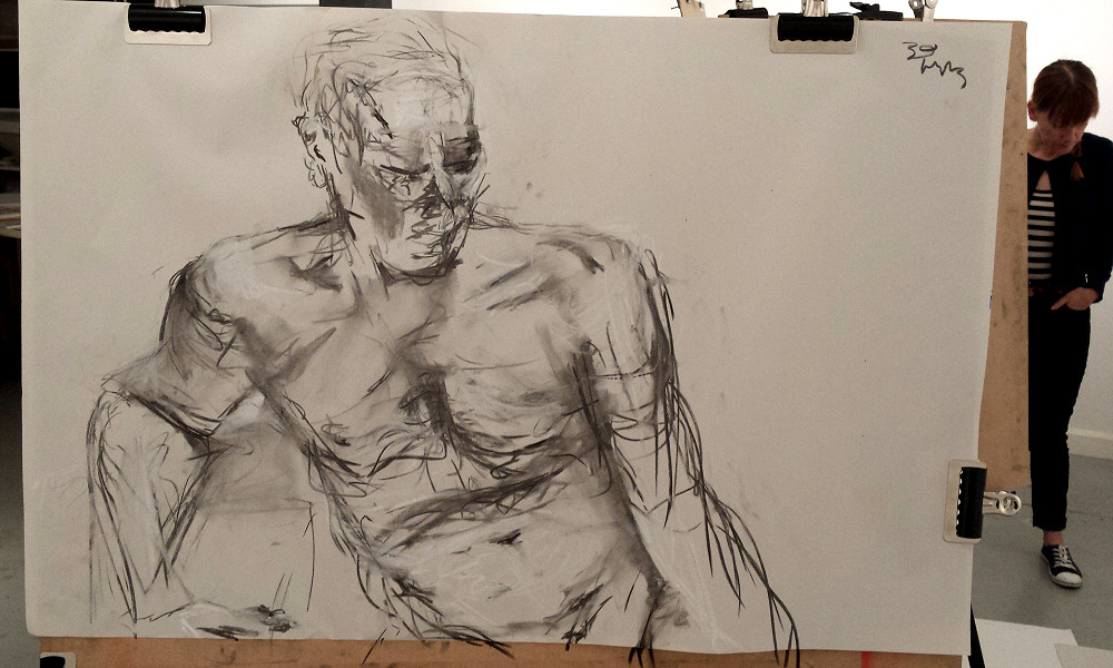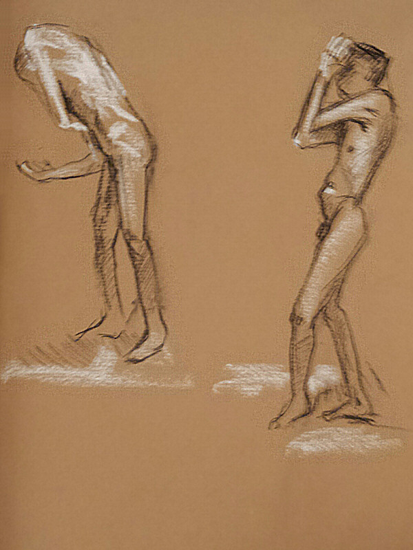 We started with two five-minute standing poses, then went into six dynamic poses of one minute each, plus a further two of just 30 seconds. Proportion and tone were the themes of discovery. One-minute poses were 30 seconds in black and 30 seconds in white. I concluded the first half with 20 minutes seated.