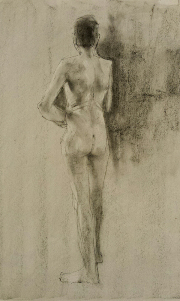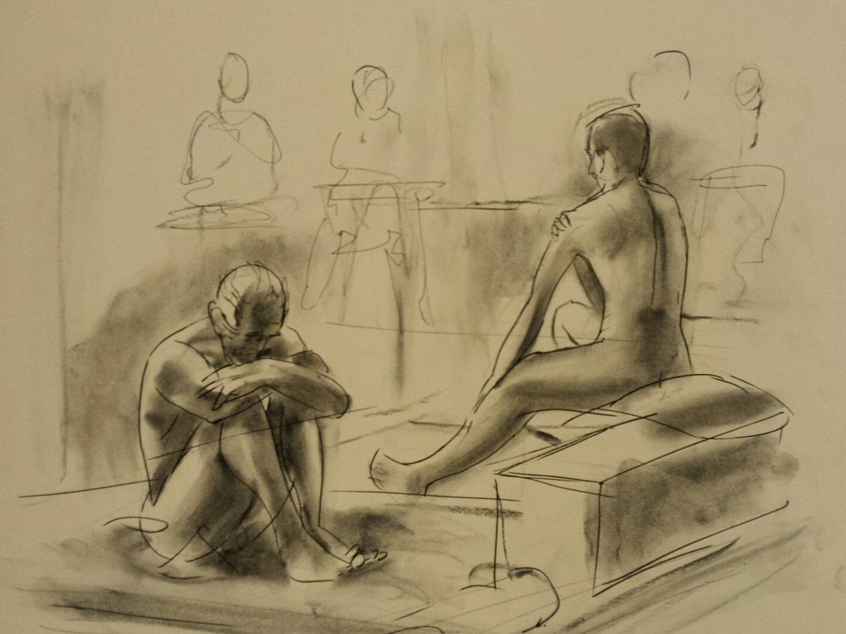 The two halves of the session roughly mirrored each other. We began with an informal 10 or 15 minute pose, during which artists drifted into readiness and drew as much or as little as they preferred. We then progressed to a quickfire dynamic sequence, and progressed towards longer 20 or 30 minute poses.