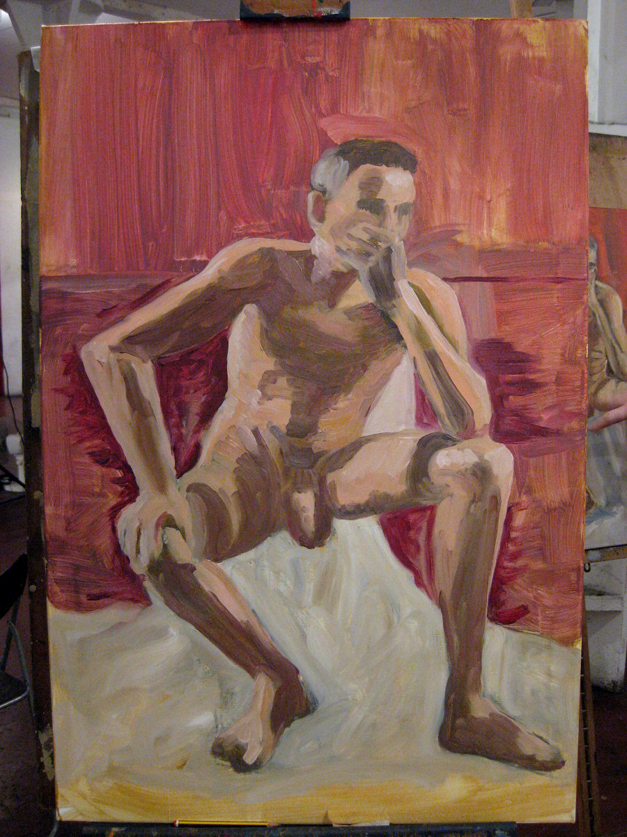 We packed away. Artists washed their brushes while I washed my feet. Four of the five canvasses were put away to dry, while one was taken home on a London bus. It would have amused me to hold the same pose (clothed) while sitting adjacent to my portrait in transit. But I had my own journey. It had been a long day; a good day.