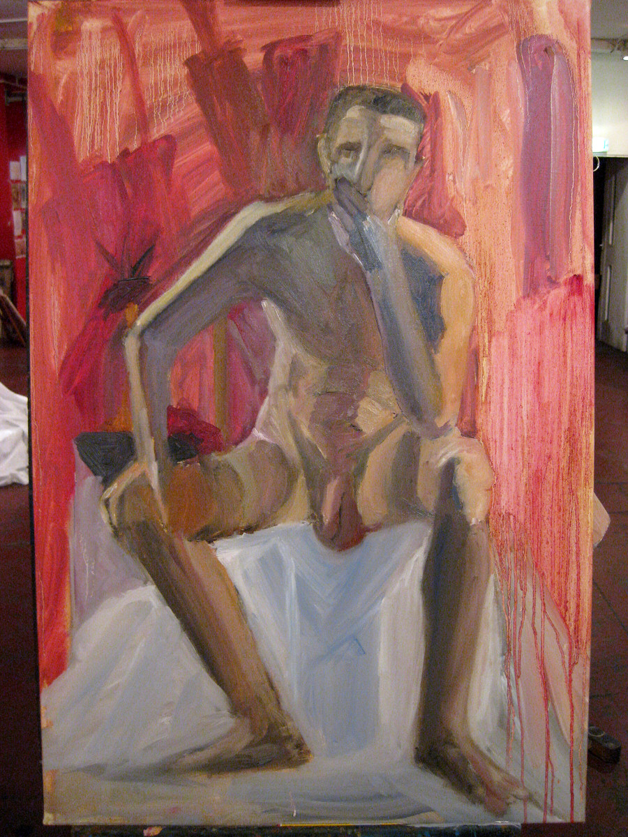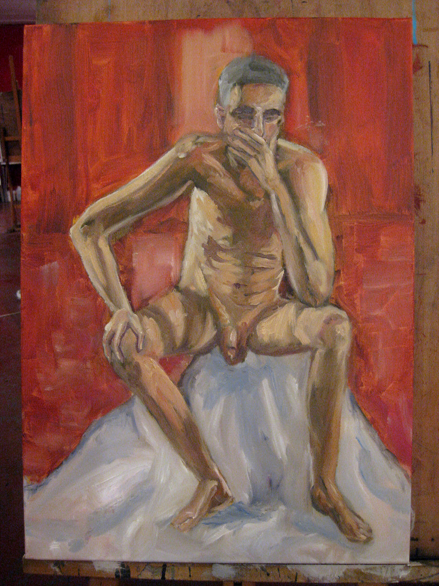 The occasion was a ‘one-day life painting course’ hosted by the Candid Arts Trust in Islington. Edward was the tutor, and it was my privilege to be his model. We would be working from 10am to 5pm with five able artists joining us to hone their skills.