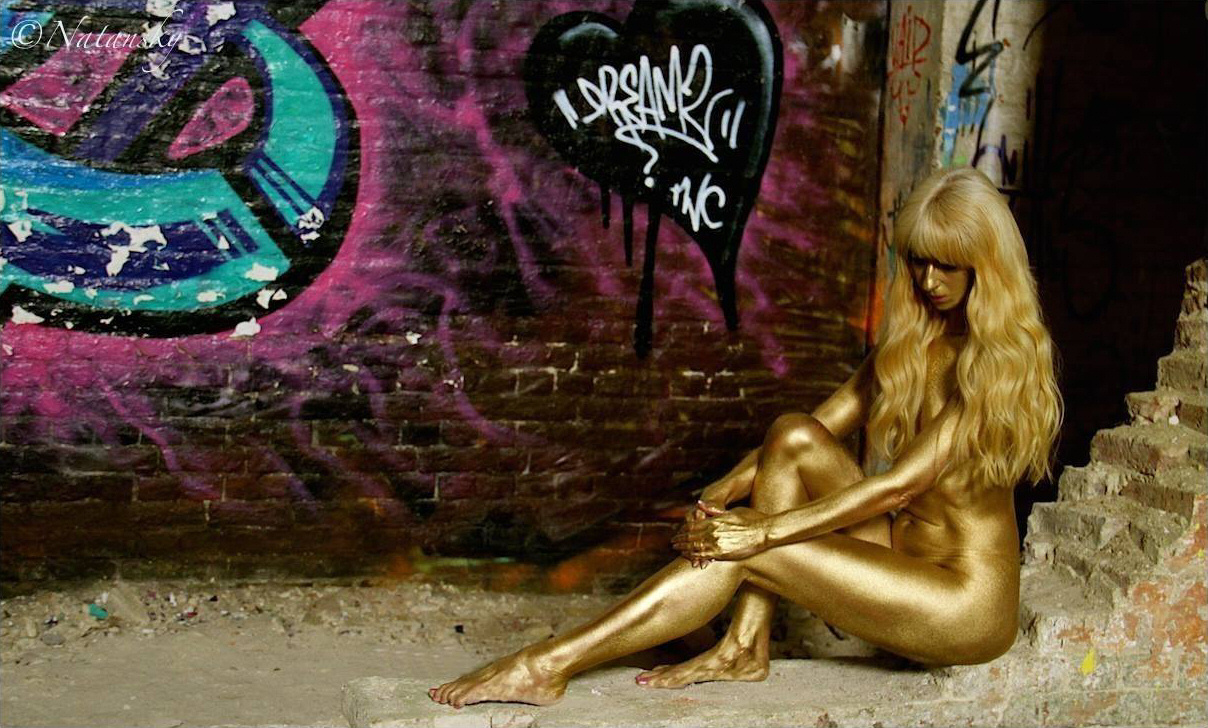For the second part of the shoot we became gold. Babylon gold. Louise, Nefretari and I first applied gold by hand to our own faces. We then dropped our gowns and allowed Paolo and Natansky to spray us from neck to toes using aerosol body paint – there was just enough to go round. Any gaps were touched-up with the face paint.