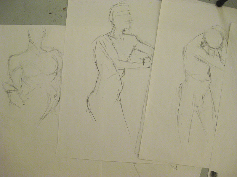 Three-minutes, two-minutes, one-minute – practising single line drawing, short curves and straight lines only. We followed this with a run of three-minute poses, sometimes using a long edge of the charcoal, sometimes drawing shade for the first half and light for the second half.