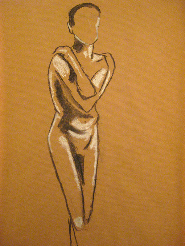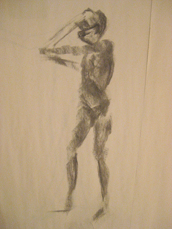 A dynamic pose – one-minute dark, one-minute light – got us re-started. A five-minute pose provided more time to refine the skill; we finished with a 30-minute standing pose that could be drawn in any way the artists saw fit.