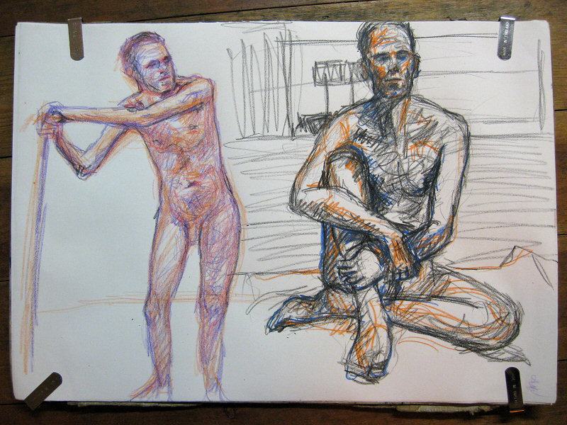 The sequence was four five-minute poses, followed by three 10-minute poses up to a break, and finally two 20-minute poses, with a finish at 9pm. Two more artists arrived during the short poses, making seven in total. There was more than enough space to accommodate 70.