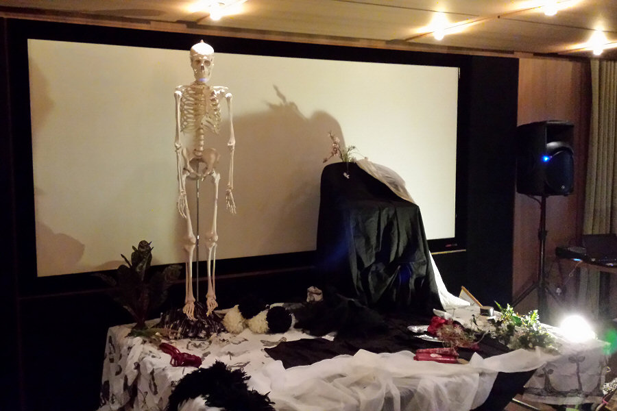 Props are paraphernalia were prepared and primped and positioned. I helped as best I could before withdrawing behind the scenes, where I would be joined by my co-model for the evening, Missy Macabre. Missy applied her own delicate make-up, while Nikki was more liberal in applying mine.