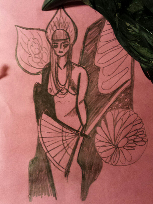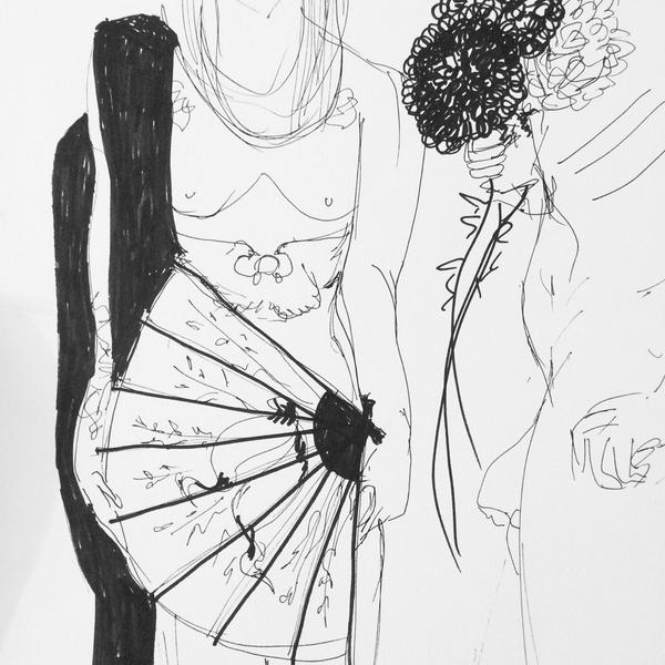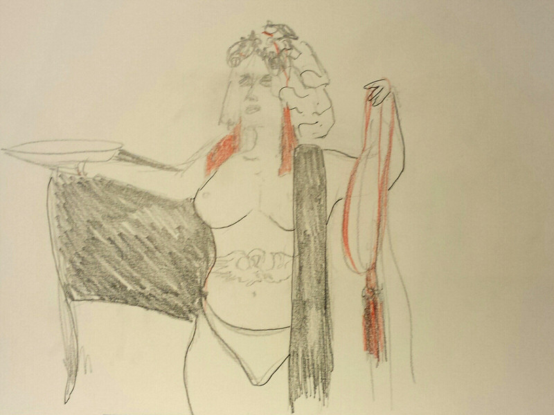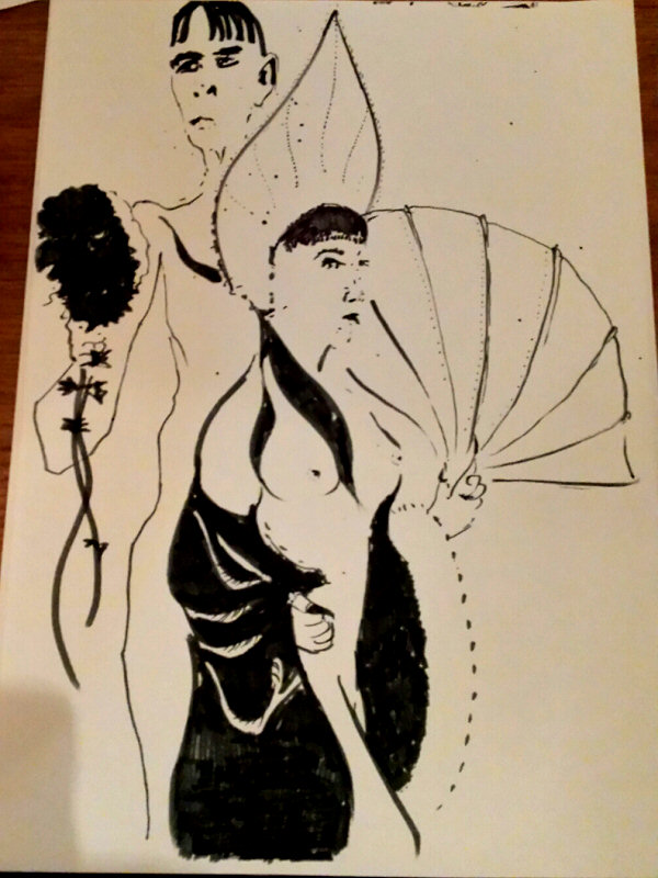 Missy then emerged, semi-clad with Beardsley-esque adornments, for our duo poses: first with me seated and then both of us standing. I held black and white flowers while Missy fluttered a delicate fan.
