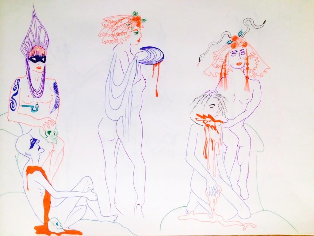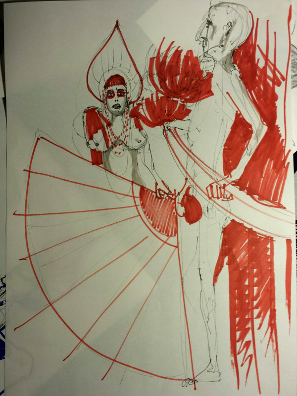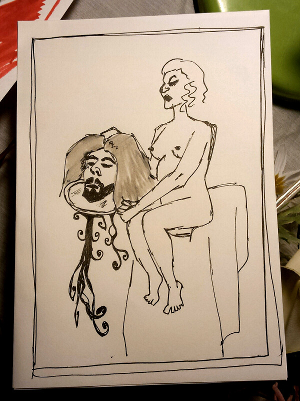 During the interval we changed make-up in readiness for a tableau that echoed one of Beardsley’s best known ink drawings: Salome with the head of John the Baptist on a plate. Missy went on stage first to pose solo with the empty plate.