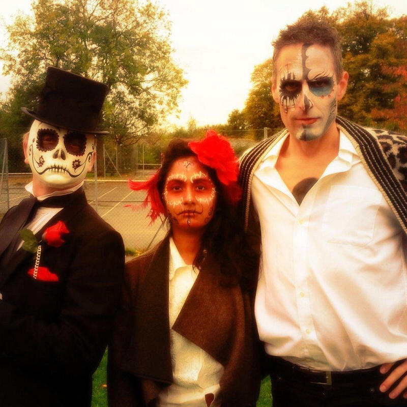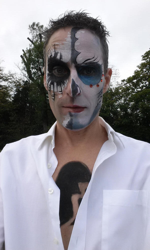 The intention was for me to be bare-chested with face and torso painted. On the day, however, in the brisk chill of November we settled for open-shirted. My semi-skeletal face paint, gems and a broken black heart were all expertly applied by Susan, an art class regular.