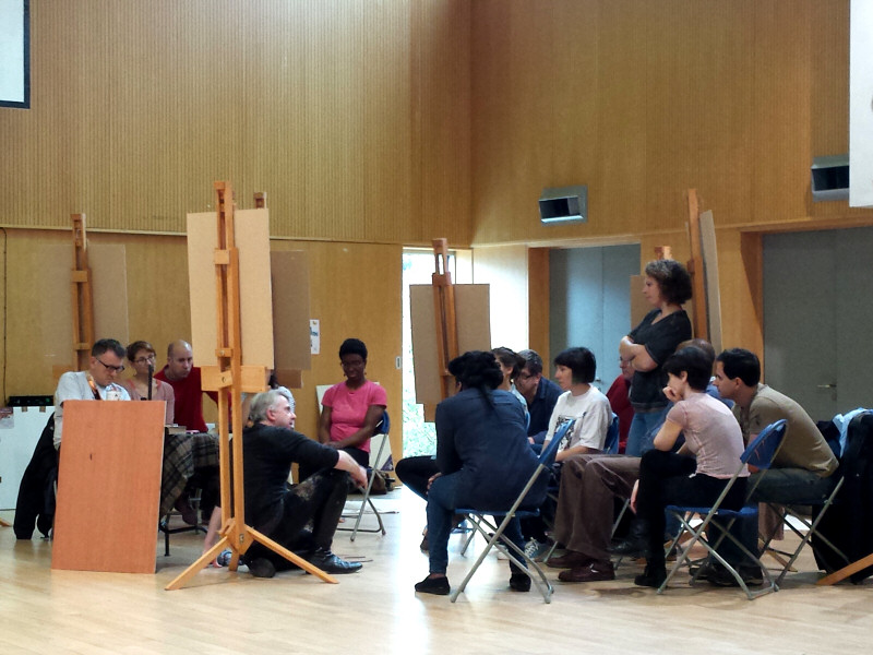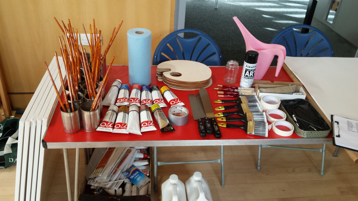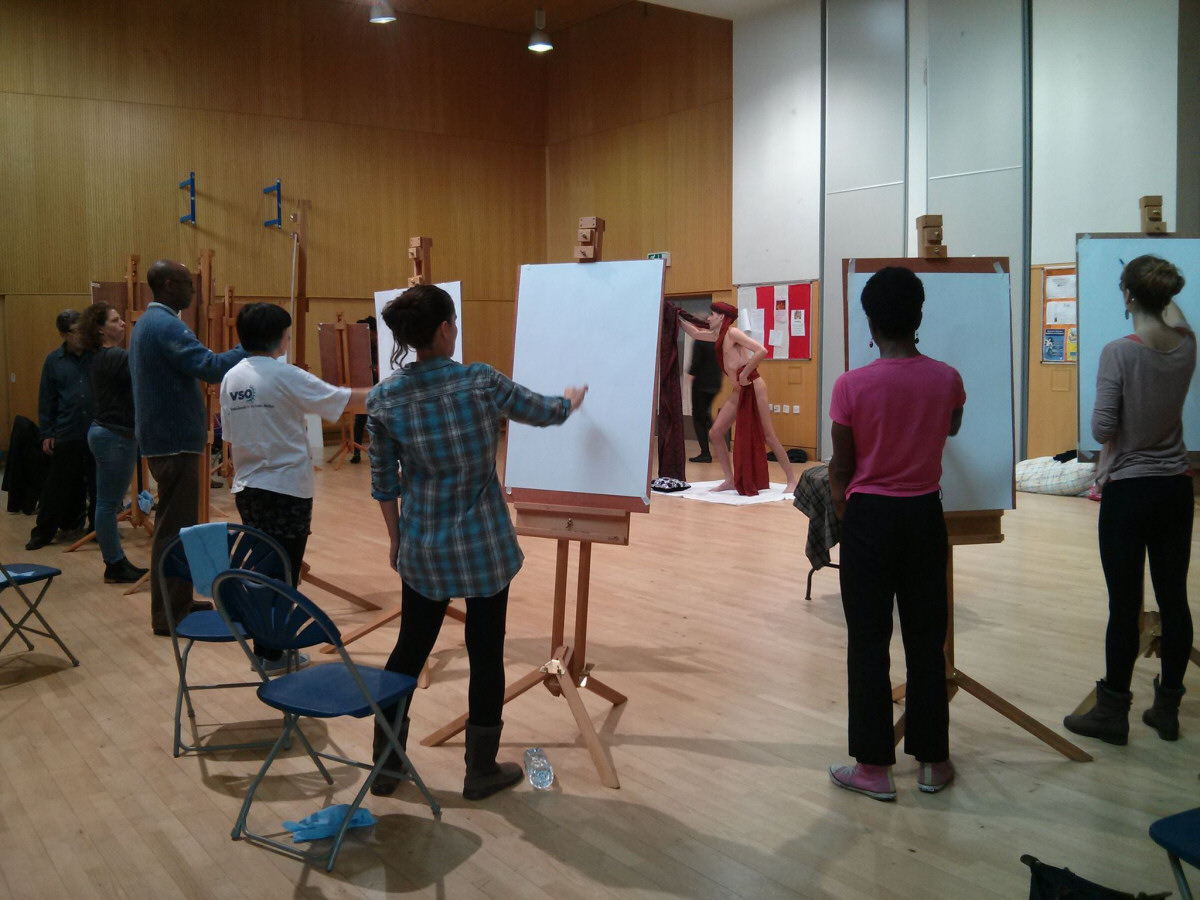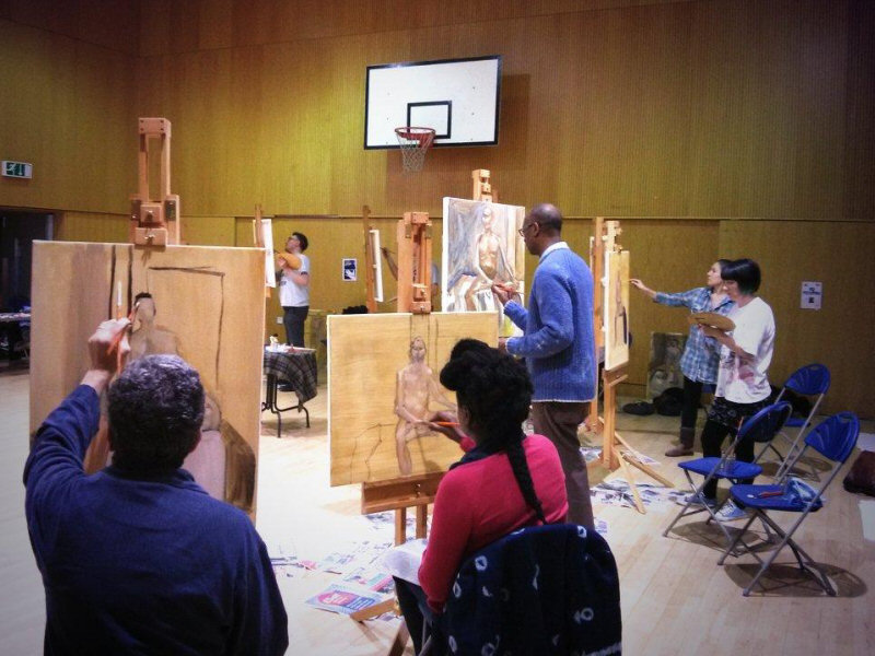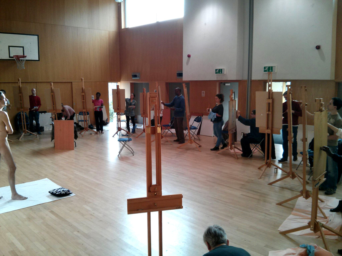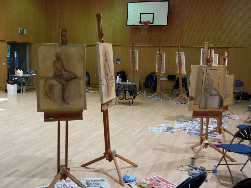 The Tottenham life painting course would be at the Triangle Centre in a community space for basketball and other indoor activities. In contrast with most art studios, the wooden floor was polished and spotless. Even more immaculate were the 15 sets of equipment for the artists. Easels, palettes, brushes, paints; all brand new and yet to see action.