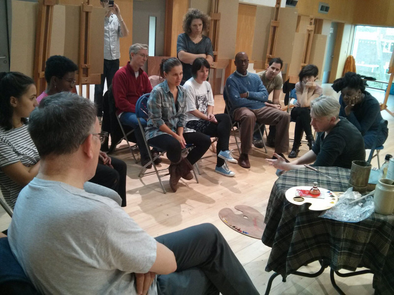 Afterwards everyone gathered around Ed. He explained the preparation of natural paint colours, his full palette of 11 colours: Titanium white; Cadmium pale yellow; Cadmium yellow; Raw sienna, “the axis of the palette”; Raw umber; Burnt sienna; Cadmium red; Alizarin crimson; Cobalt blue; Ultramarine; Ivory black, a reduced palette of 6 colours, and how to prepare the canvas.