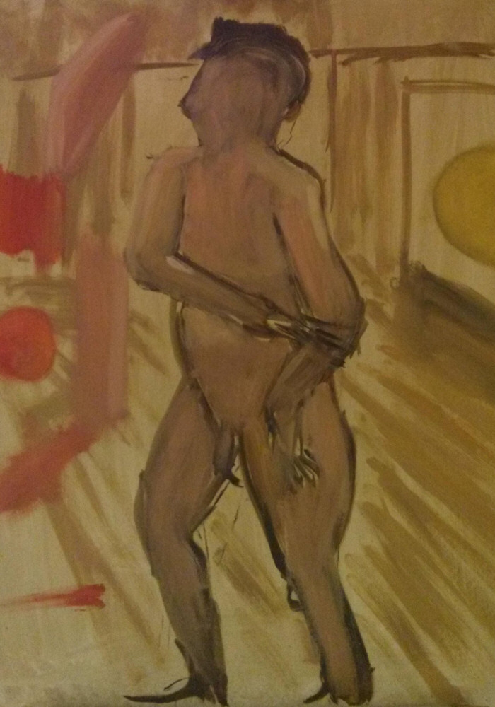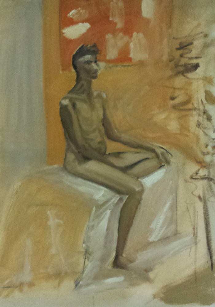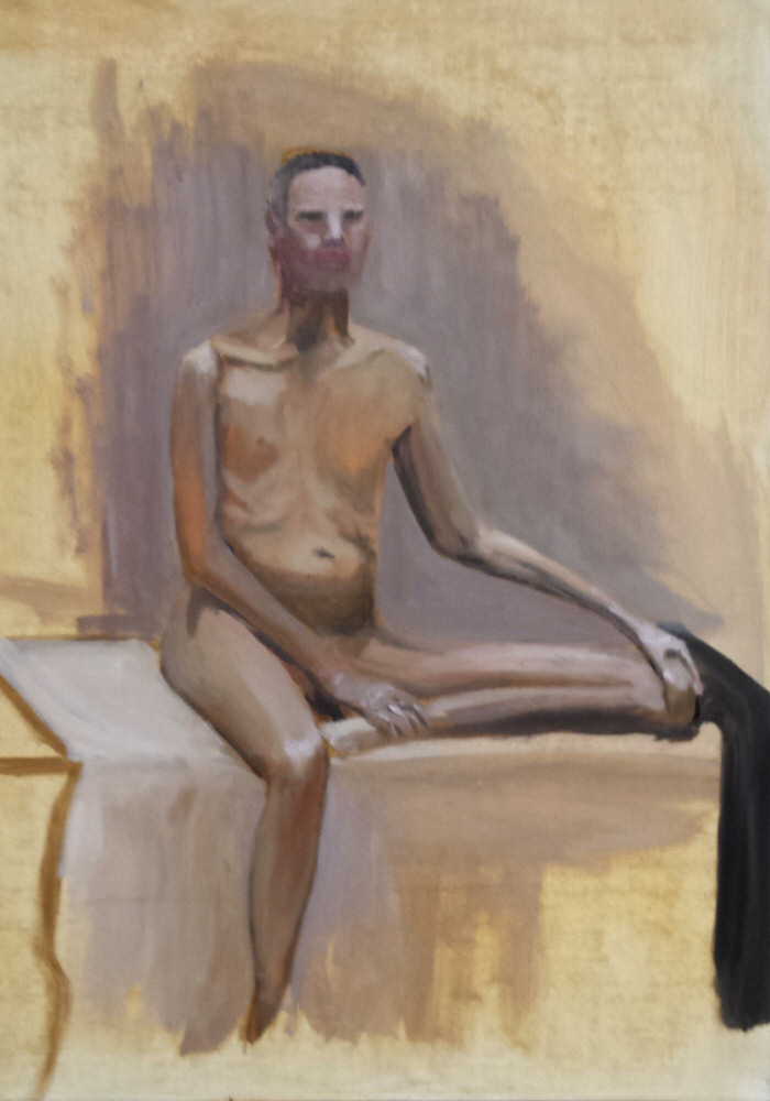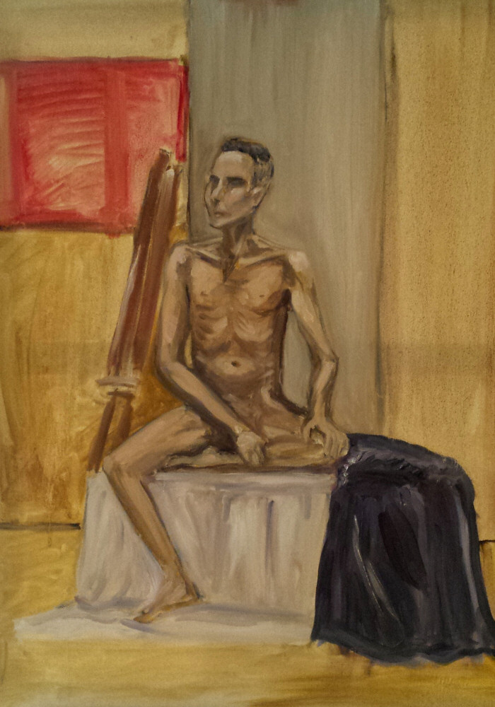 I gave a lot of thought to my choice of poses. The first would be standing: I placed one foot slightly forward with an even weight distribution; I kept one arm straight, with hand on thigh; the other arm was across my body. Most of the artists had never handled oil paints in their lives so I kept this pose purposely simple – I didn’t want to add an extra level of challenge and needlessly distract from their familiarisation with the materials.