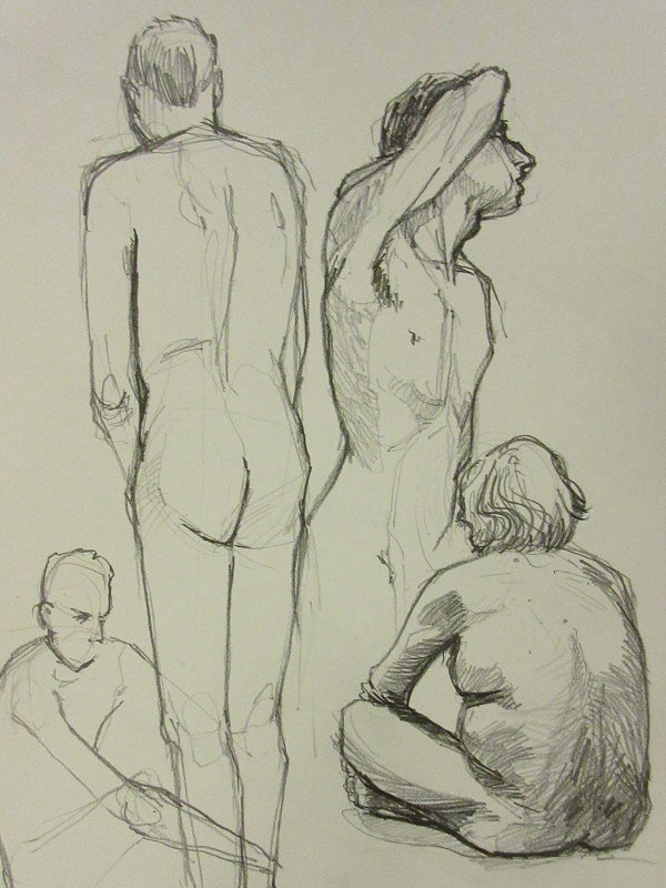 Finally for this first half of the evening, Maurice reclined for 20 minutes while I reclined and stood for 10 minutes apiece. The break that followed could last up to half an hour for artists. Models, however, resumed with informal sitting poses after just 15 minutes for those keenest to continue drawing.