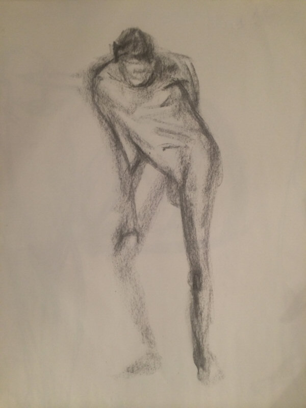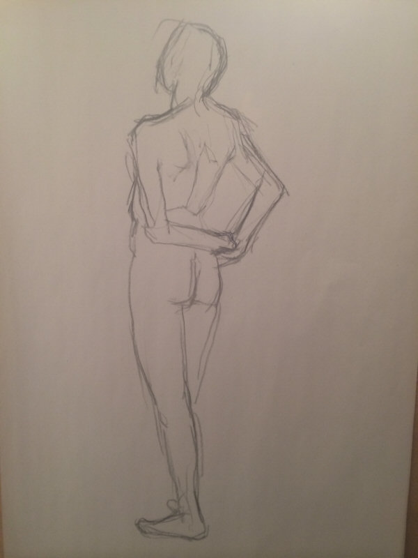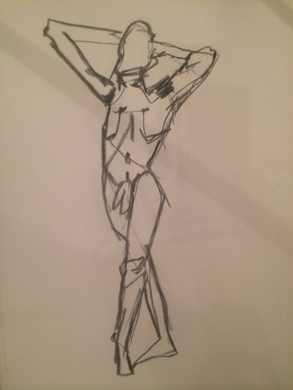 Seven of the eight expected artists arrived; we set to work. My first standing pose of 6 minutes was to be drawn blind – eyes to the model, not to the paper. An extraordinary array of forms were created: some surprisingly proportional, others capturing pleasing details, and yet others with a multiplicity of lines that created an animation effect.