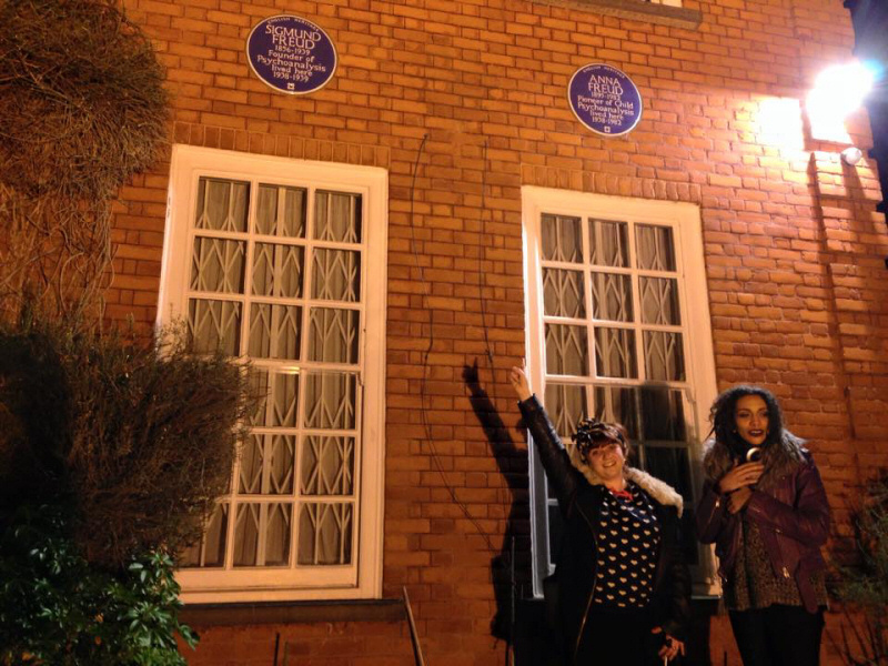 So I went to the home of Sigmund Freud. It was after dark as I approached the only well-lit building in an otherwise shadowy residential street. I spotted gifted artist and occasional model Farida reading a noticeboard in front of the house. Simultaneously emerging through the gloom from the opposite direction was actress, model, milliner and star of burlesque, Ava Iscariot.