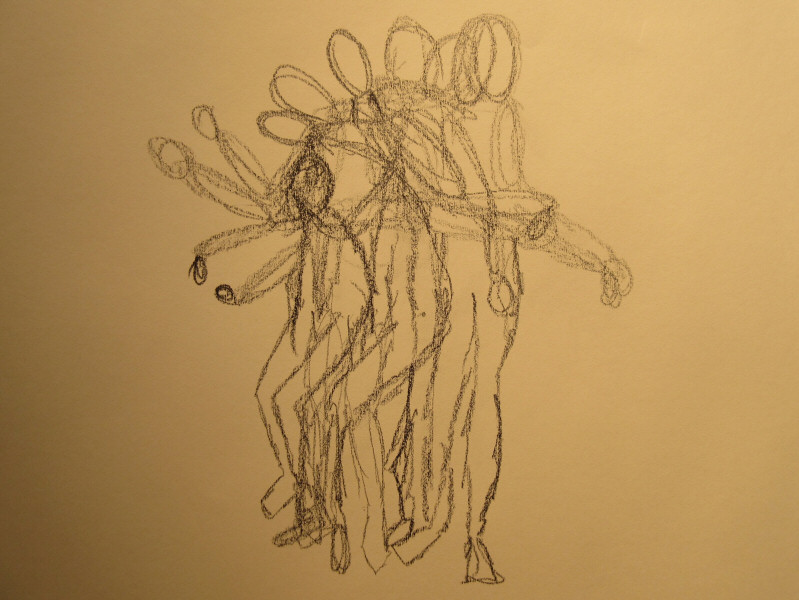 The drawing above was one young artist’s first attempt at this type of study. He even needed a quick Google image search for examples of what it’s supposed to be; yet I reckon this is as fair an execution as I have seen. We followed it with a sequence of four 3-minute poses that together showed a single developing position.