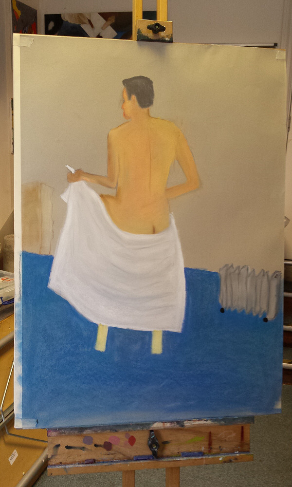 Next, for half an hour either side of our lunch break we took inspiration from an ‘After the bath‘ painting by Edgar Degas. In the absence of a bath towel I used my folded super-kingsize posing sheet as our prop. It meant I had to anchor one elbow into my side to support the extra weight, but the pose worked and the art was good.