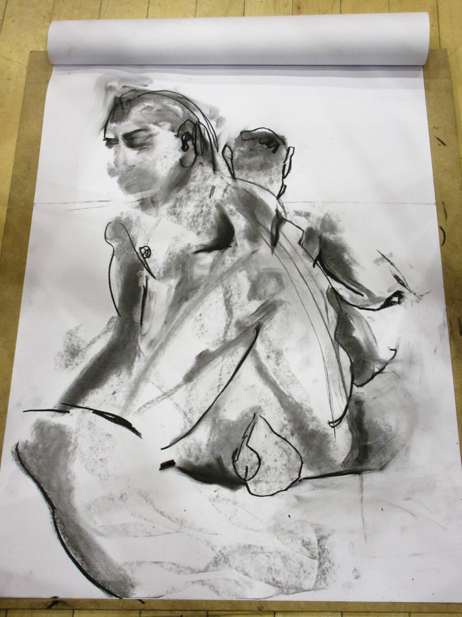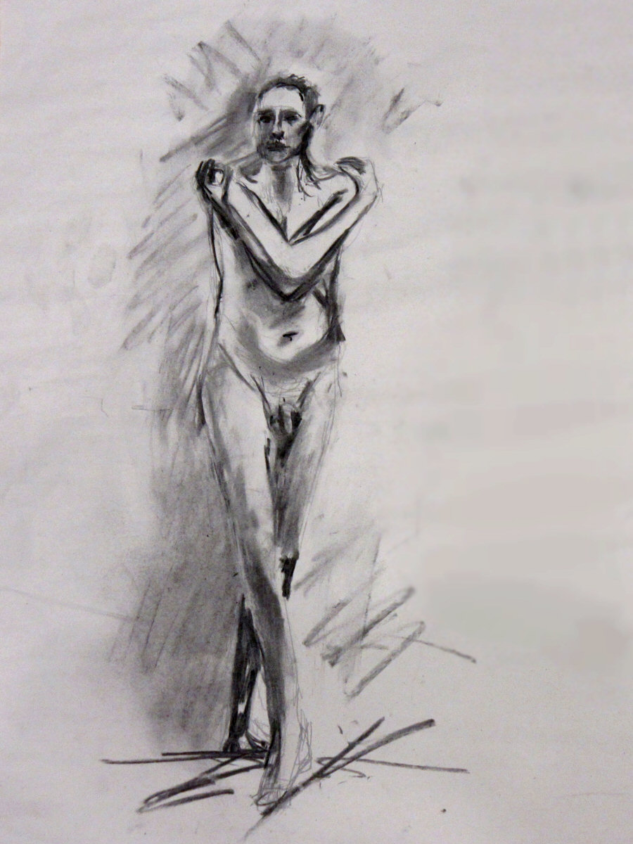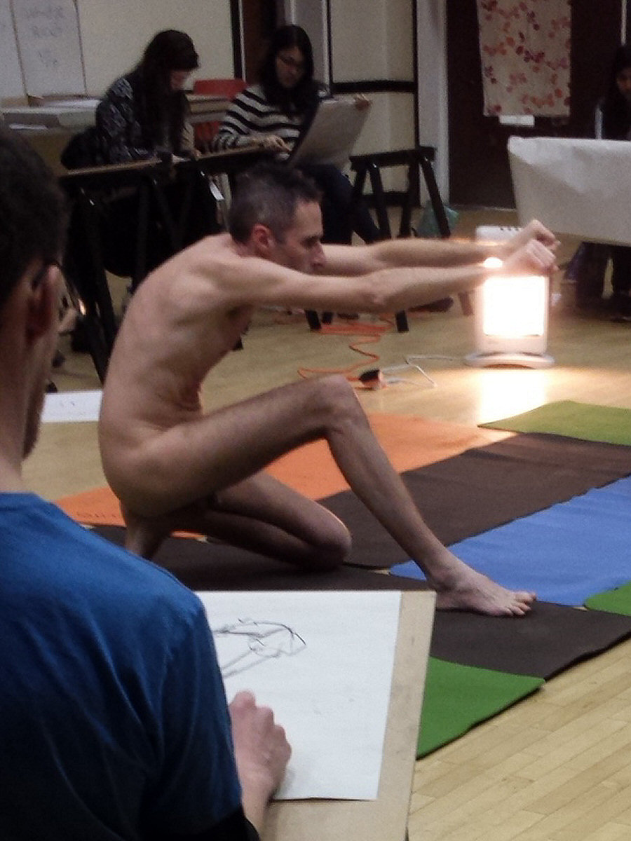 We were spoiled with no fewer than four electric heaters: two heavyweight units at the corners of the square farthest from the door, and two smaller ones nearer the carpet of yoga mats on which we would pose. With a good turn-out of artists seated and primed to draw, Adrian introduced us. We slipped off our robes and started our first 10-minute standing poses.