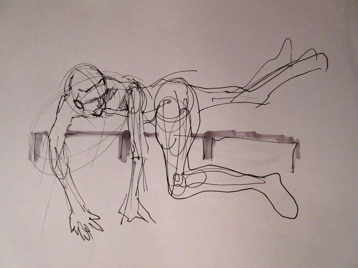 Instead I put in a bid for drinks at the bar and settled down with Tatiana and artists to chat away the remainder of the evening. And the model in that drawing just above the one of me on the wall – the bold outline curve of a woman’s back? Tatiana herself.