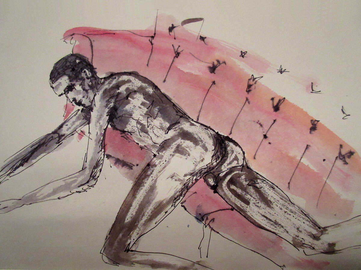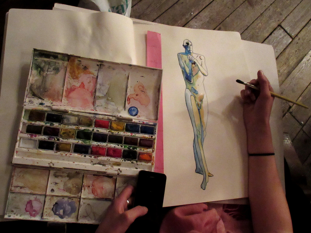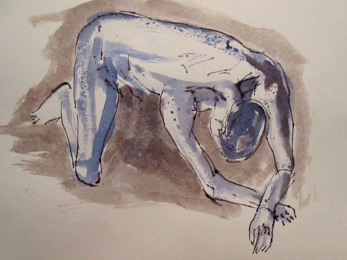 All done, I covered up and followed Tatiana in photographing artworks. The one I kept returning to was an extraordinary watercolour that I confess – if it’s not too vain to do so – I fell in love with. It was based on the second of the 10-minute poses though the artist continued developing it throughout the evening.