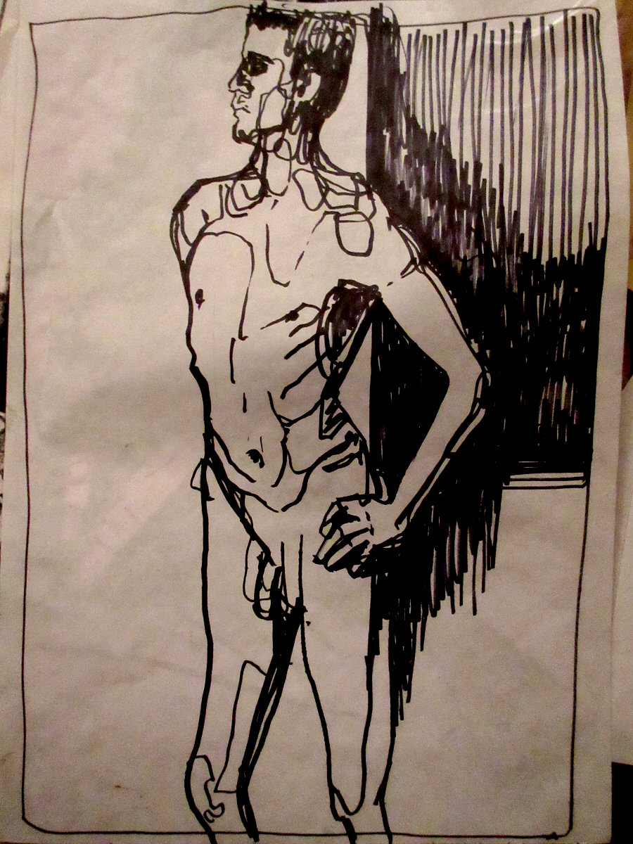 We began with four 2-minute poses: three standing, one crouched down, all featuring an attempt at dramatic arm gestures. Next came three 5-minute poses: two standing and one making use of the bright red couch behind me; an exotic item now looking a shade more worn than I recalled, but then I probably look a shade more worn myself.