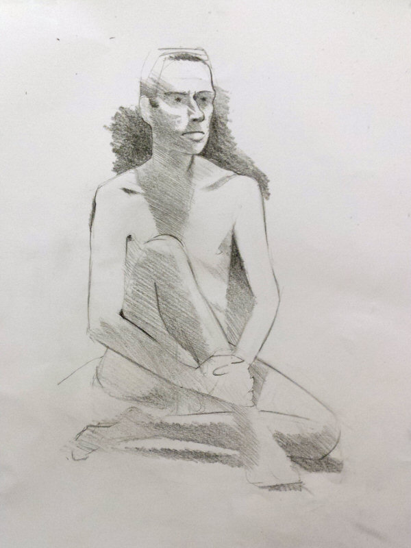 After the break I had a go at finding a semi-reclining position that would be suitable for all artist vantage points, but failed, and instead sat cross-legged with hands on knees. There were a few murmurs of surprise and doubt that I would hold this for a long pose, but I knew it would be relatively comfortable for my peculiar build.