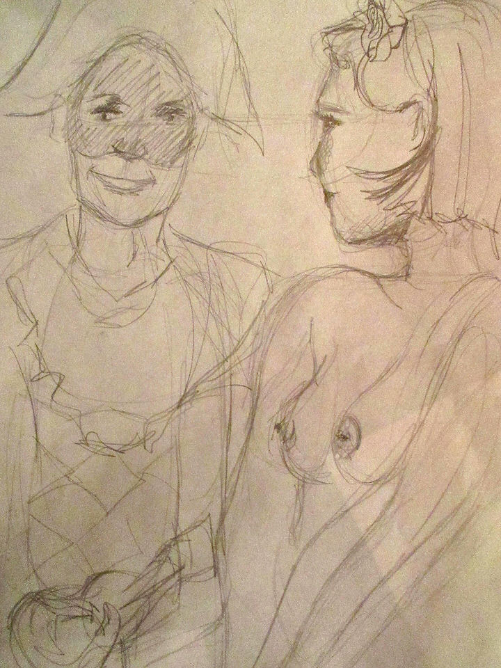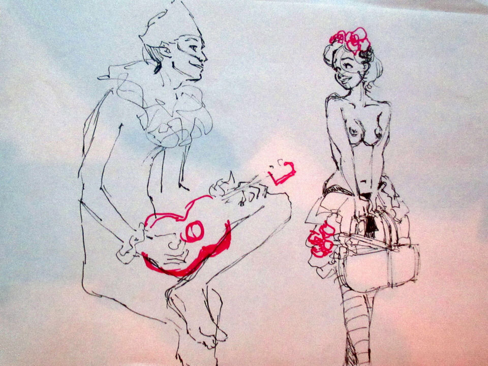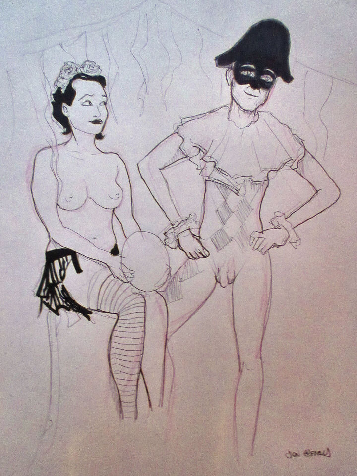 When I’d finished spreading joy, we welcomed back FiFi and Mary Beth for our first group tableau. Harlequin, with little red ukulele, would be serenading Colombina while a jealous Pierrot sat unhappily alongside. FiFi and I would be gazing into each other’s eyes for 10 minutes…