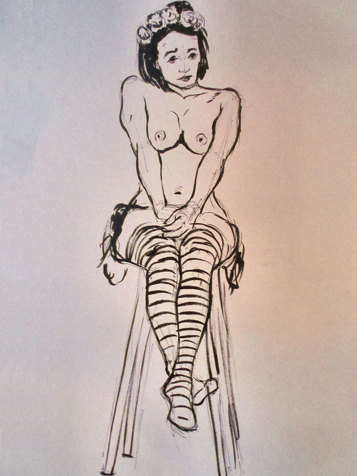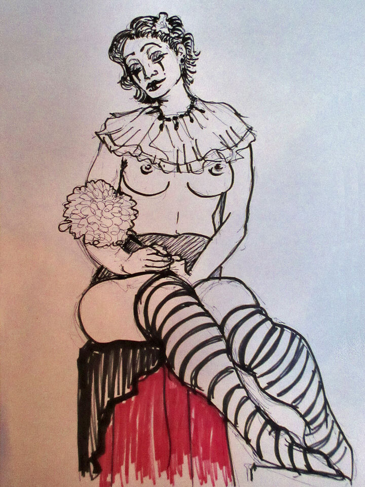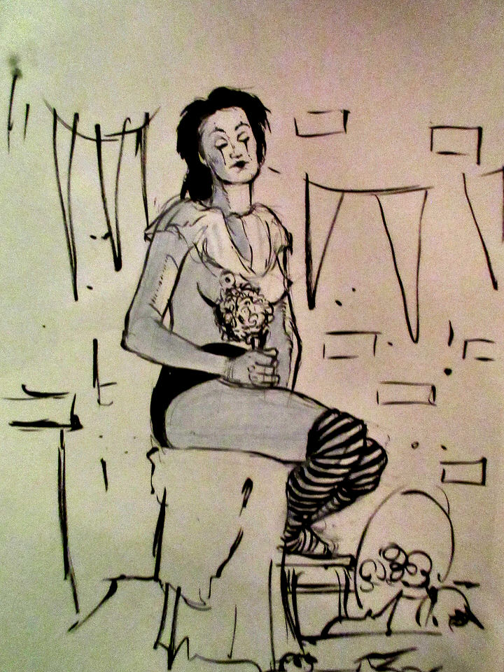 All set, the artists were let in to collect drawing materials and gather into comfortable arcs around our little platform. Nikki stepped forward and first challenged everyone to take one minute to design their own macabre clown face. She then set the scene for the poses we would be presenting.