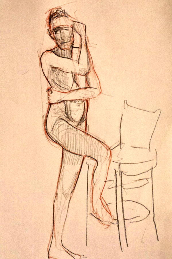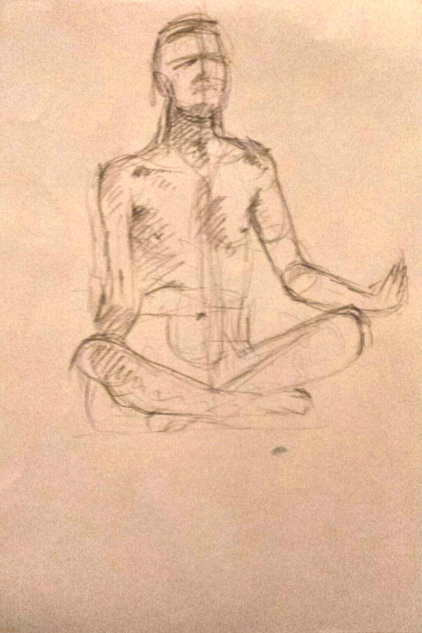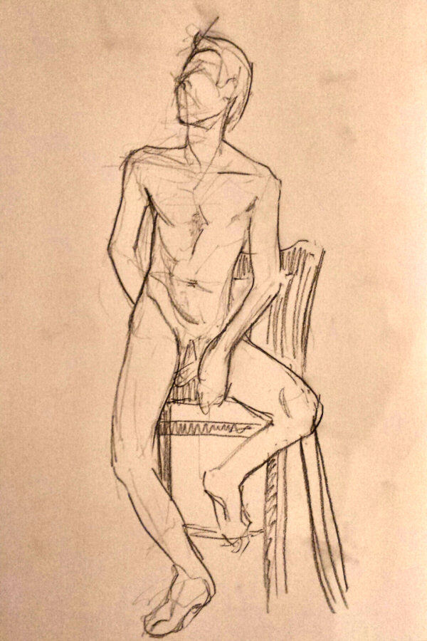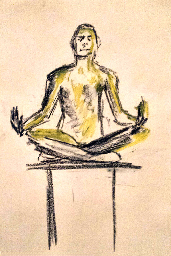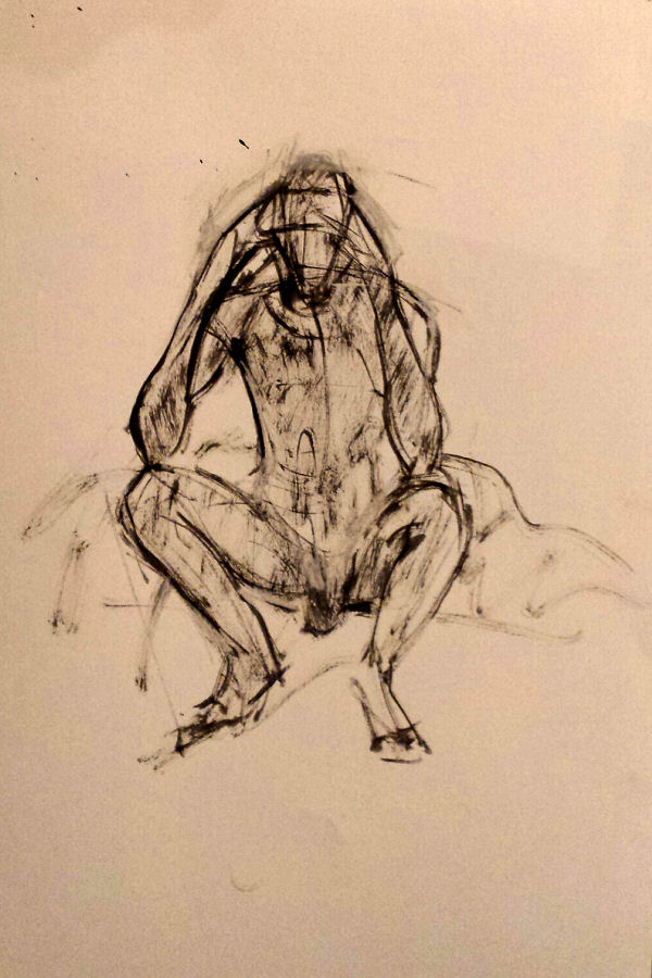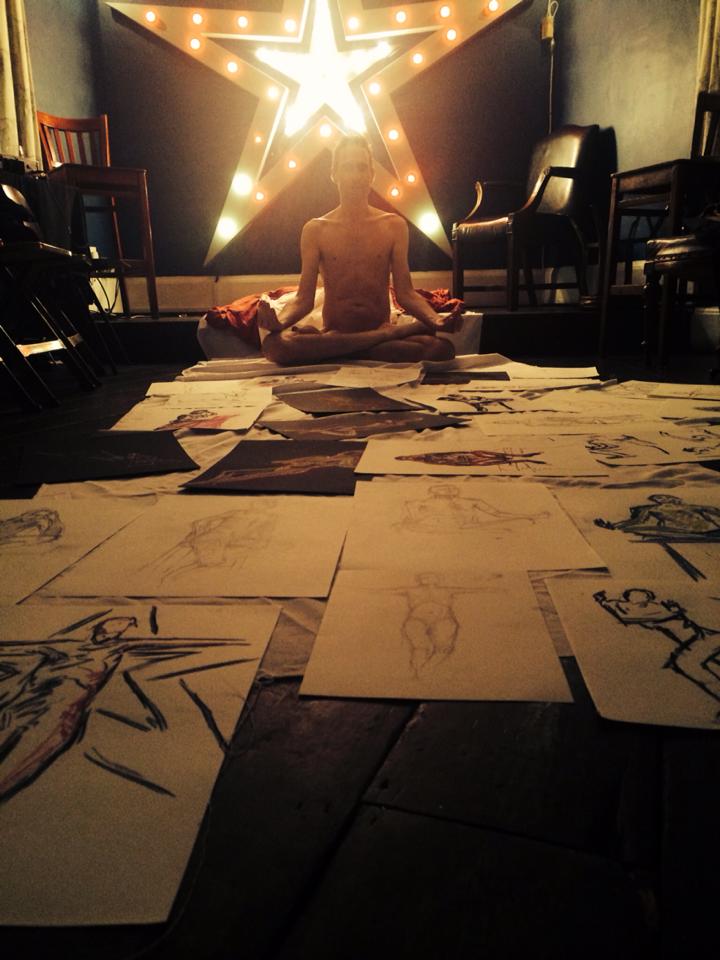 After a break we completed our evening’s work with a 15-minute pose slouching in a small leather chair, and finally 10 minutes squatting before the bright bulb-lit star. All done, the entire floor became a carpet of drawings. This evening’s art had been of a particularly good quality. I reprised my yoga pose for photos in their midst before we cleared away.