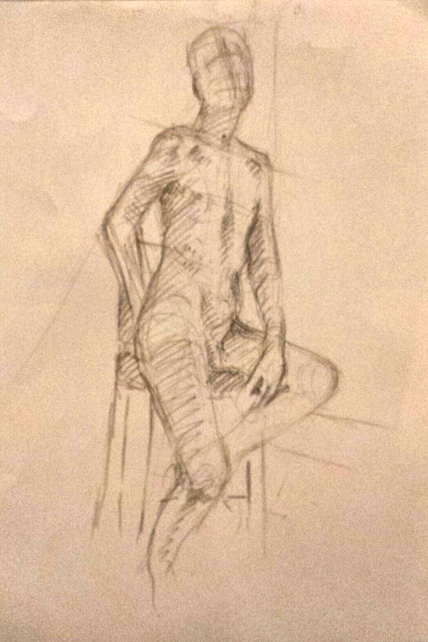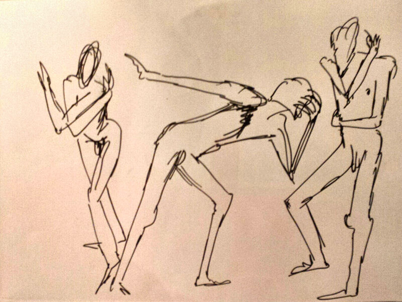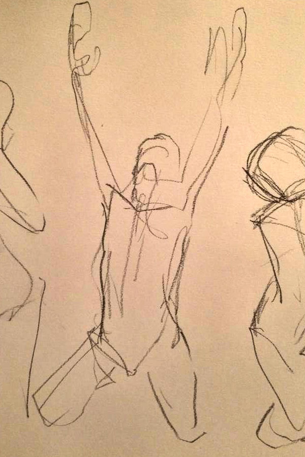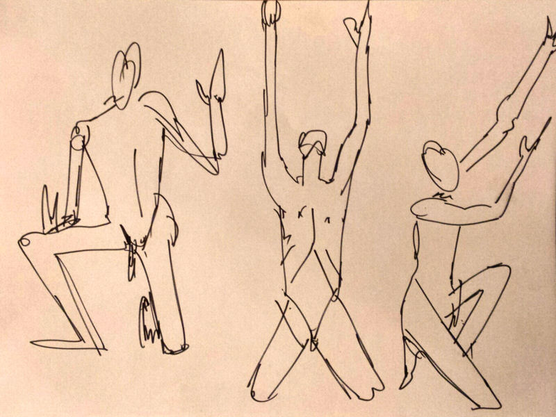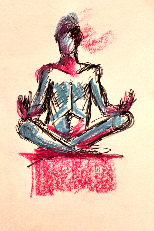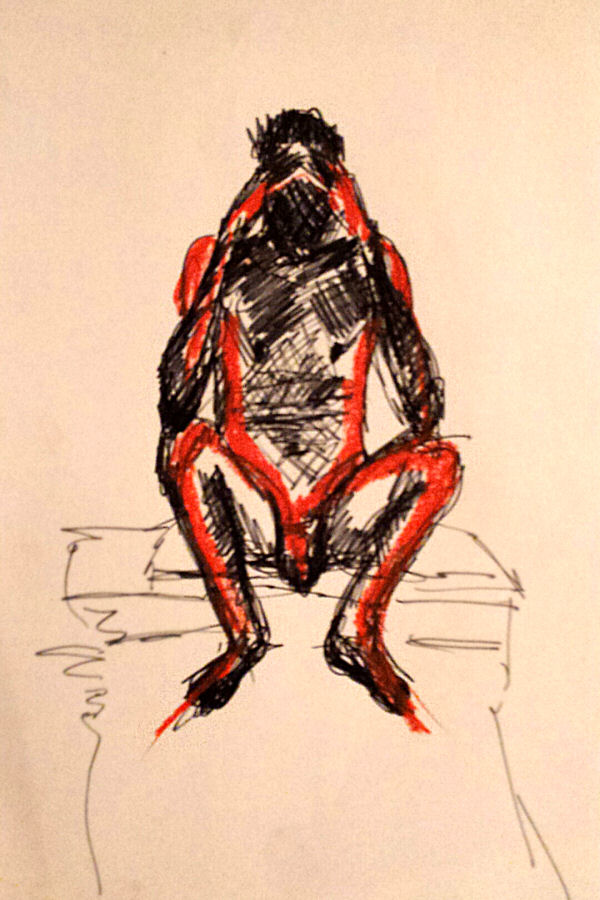 After a break we completed our evening’s work with a 15-minute pose slouching in a small leather chair, and finally 10 minutes squatting before the bright bulb-lit star. All done, the entire floor became a carpet of drawings. This evening’s art had been of a particularly good quality. I reprised my yoga pose for photos in their midst before we cleared away.