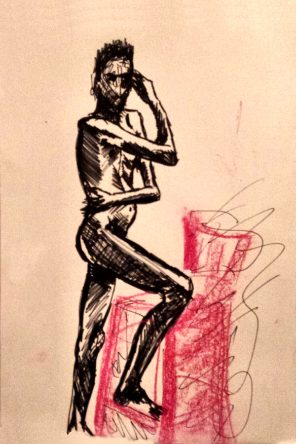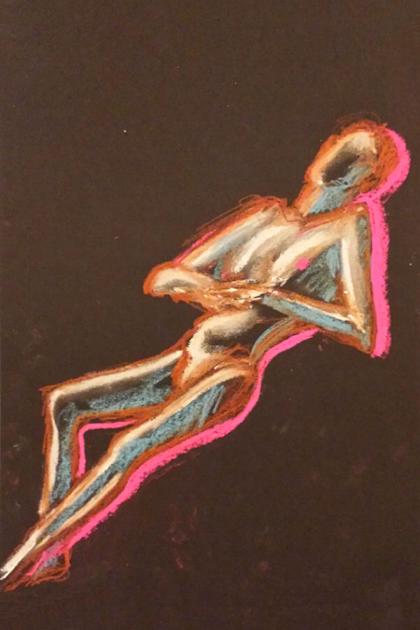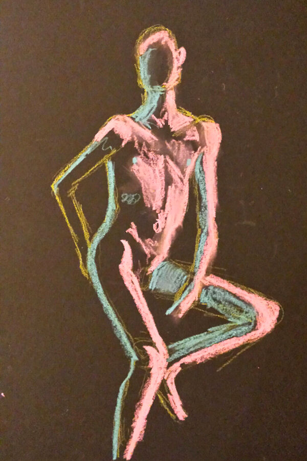 Next to arrive was Carla Nizzola, the artist who runs the group jointly with Catherine. Together they finished preparing the pose space, plugging in our evening’s music and setting out materials – included in the £7 price – for the artists. We talked through the pose times, looked at some inspirational pieces, and at 7:30pm we were ready.