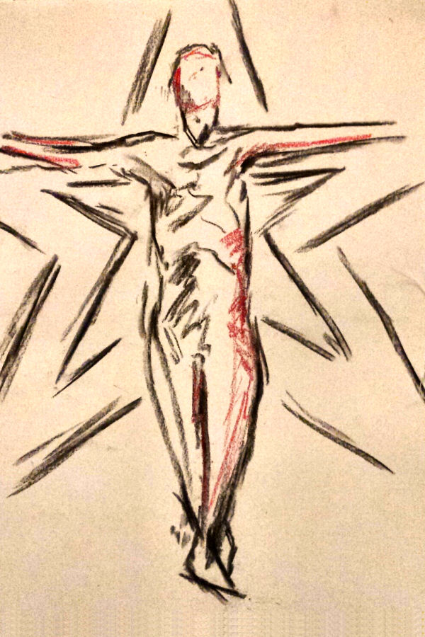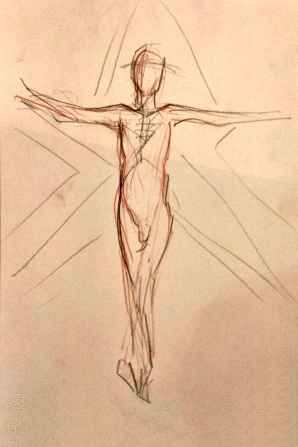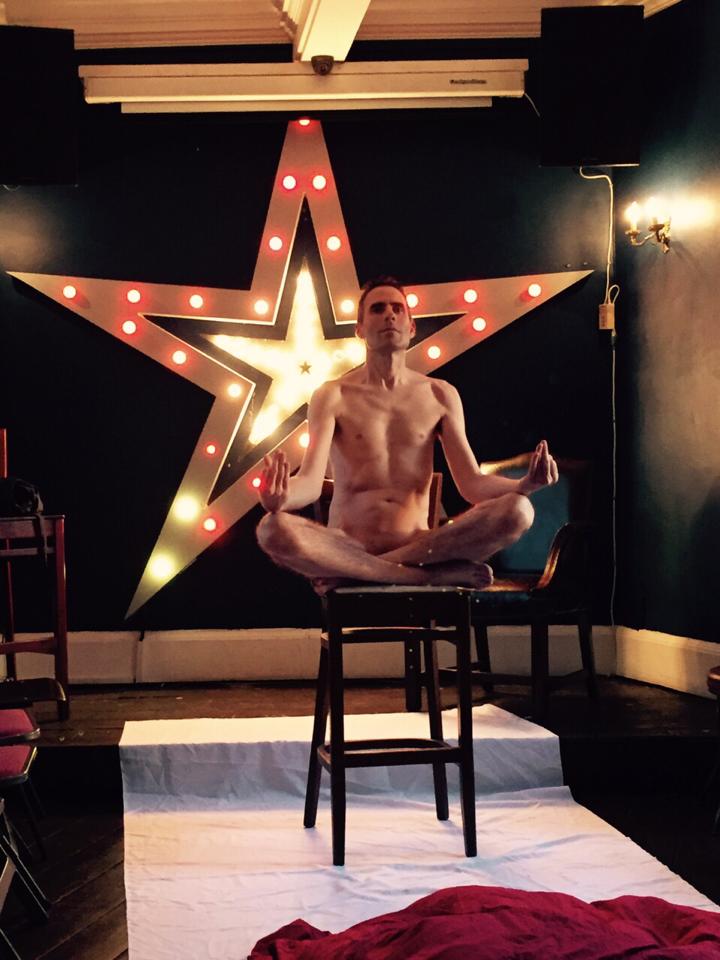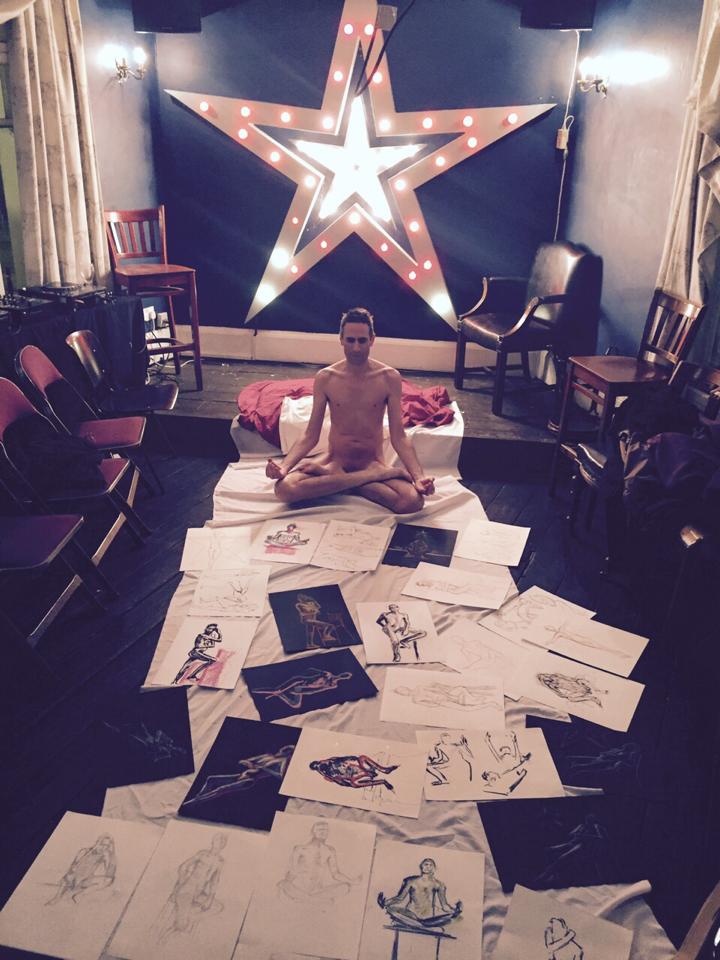 For 3 minutes I stood in a crucifix stance across the star itself, occasionally flinching my buttocks away from the hotter bulbs. We next went dynamic with three 1-minute and three 30-second poses, before finishing the first half with 15 minutes standing in the style of Rodin’s sculpture ‘Eve’.