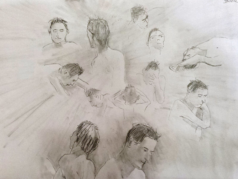 Mark called pose timings in a broadly similar arrangement to those favoured by Adrian himself. 10 minutes (while the latecomers arrived) to begin, then dynamic and medium poses: five of 1-minute, followed by 3, 3, 5, 5, 10 and 15 minutes up to the break.