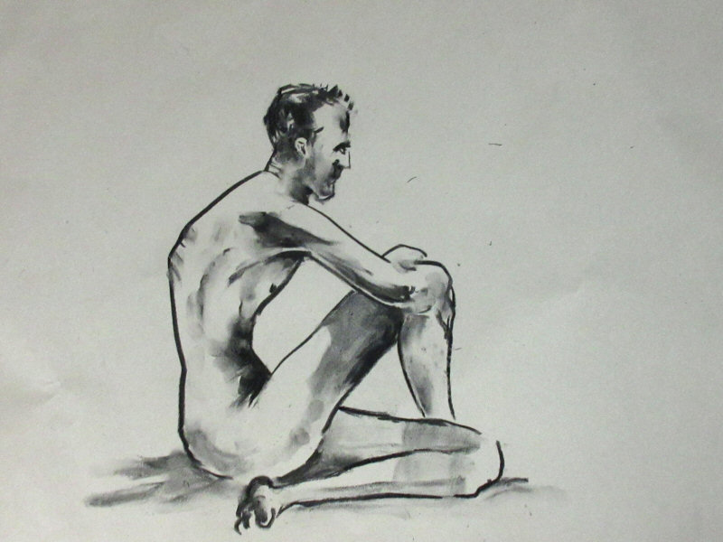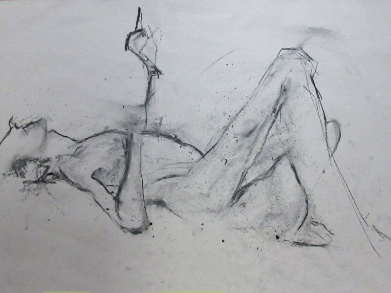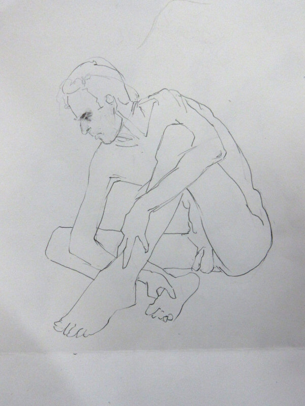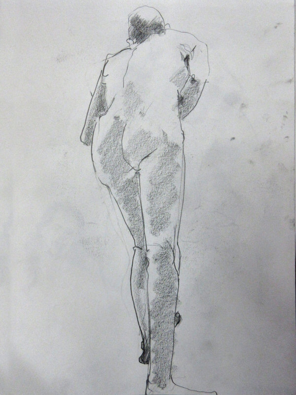 I started at 7pm with five lots of 5-minute poses, then followed with 10 and 10 minutes to our break. After a nice mug of tea I resumed for 24 minutes and finally 25 minutes up to 9pm. The artists sat as a circle around me so I changed direction throughout. Having a huge amount of space to work in, artists sometimes changed position too.