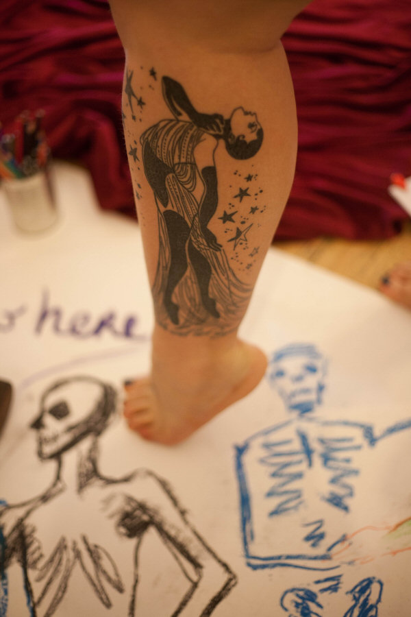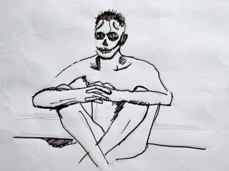 Nikki had created a pose space near the refreshments. A crimson sheet bordered with candles and guarded by ‘Stanley’ the skeleton marked our area. Some chairs, paper, and various other drawing materials had been set out but there was no announcement or ceremony to accompany our presence.