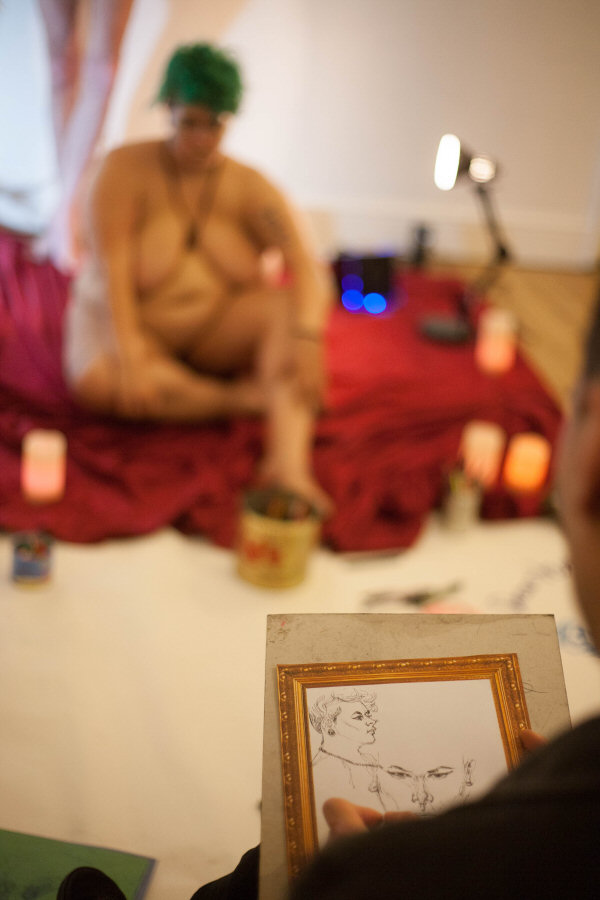 We had been asked to model for only half an hour each, but why stop when things are going well? Gee took a break to chat with our mutual friends among the guests, while Nikki passed me some red wine. I was comfortable, people were still keen to draw, so I simply carried on.