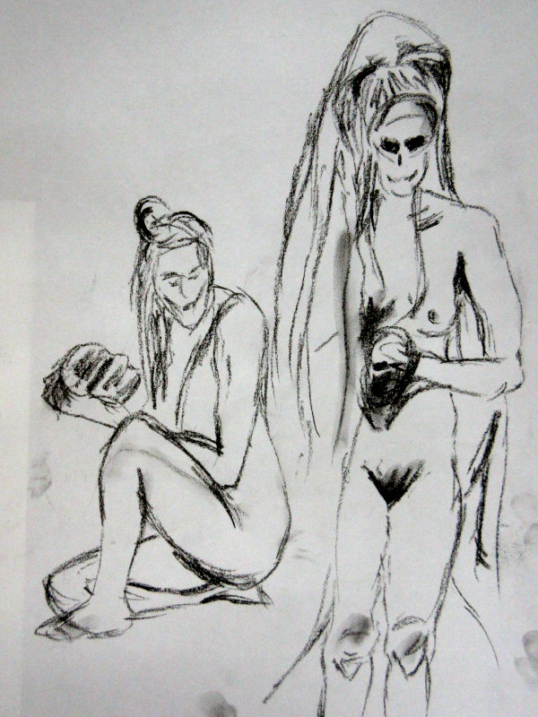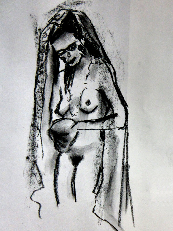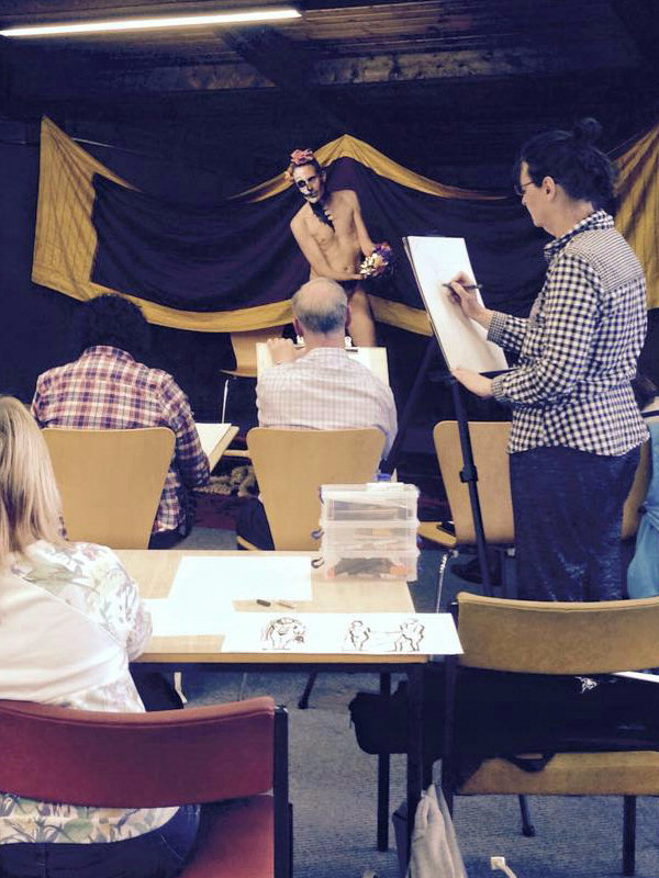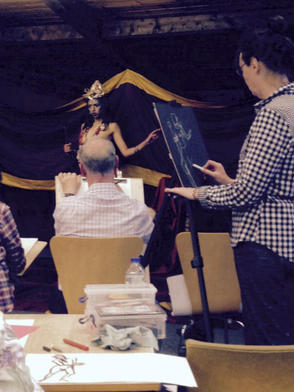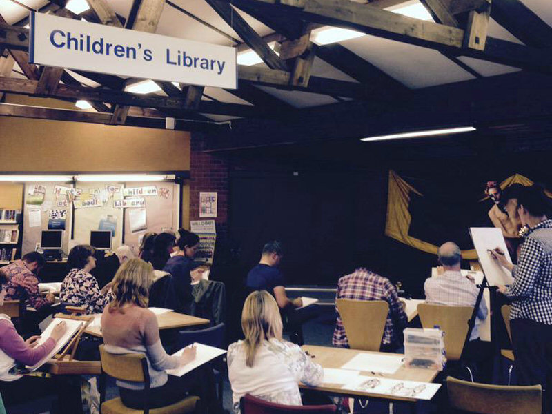 The librarians of Woodley had prepared a magnificent spacious platform for us to pose on, just beyond line of sight from the building’s wide glass façade. Seats in front of our stage were soon occupied by artists. Nikki welcomed them all, shared some historical context and then introduced Maya for her opening warm-up poses: 1, 3, 5, 7 minutes.