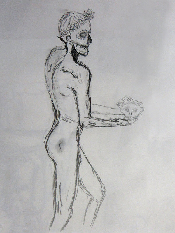 As we were on virgin territory, Nikki could reprise some classic global curiosities from her bygone death drawing salons. First Maya would be Mayan. Did that mean I would be Steven? Apparently not. I would start off Mexican, with one half of my face painted in sugar-skull style.