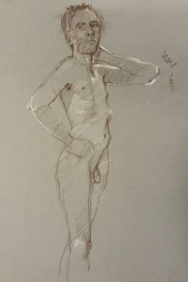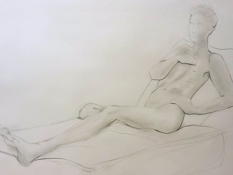 I would be providing four poses for them: 10 minutes standing, 20 minutes seated and 20 minutes standing, up to our break. After tea and biscuits I settled down to a single 45-minute pose reclining on a huge inflatable bed – rarely have I known comfort like it whilst modelling.